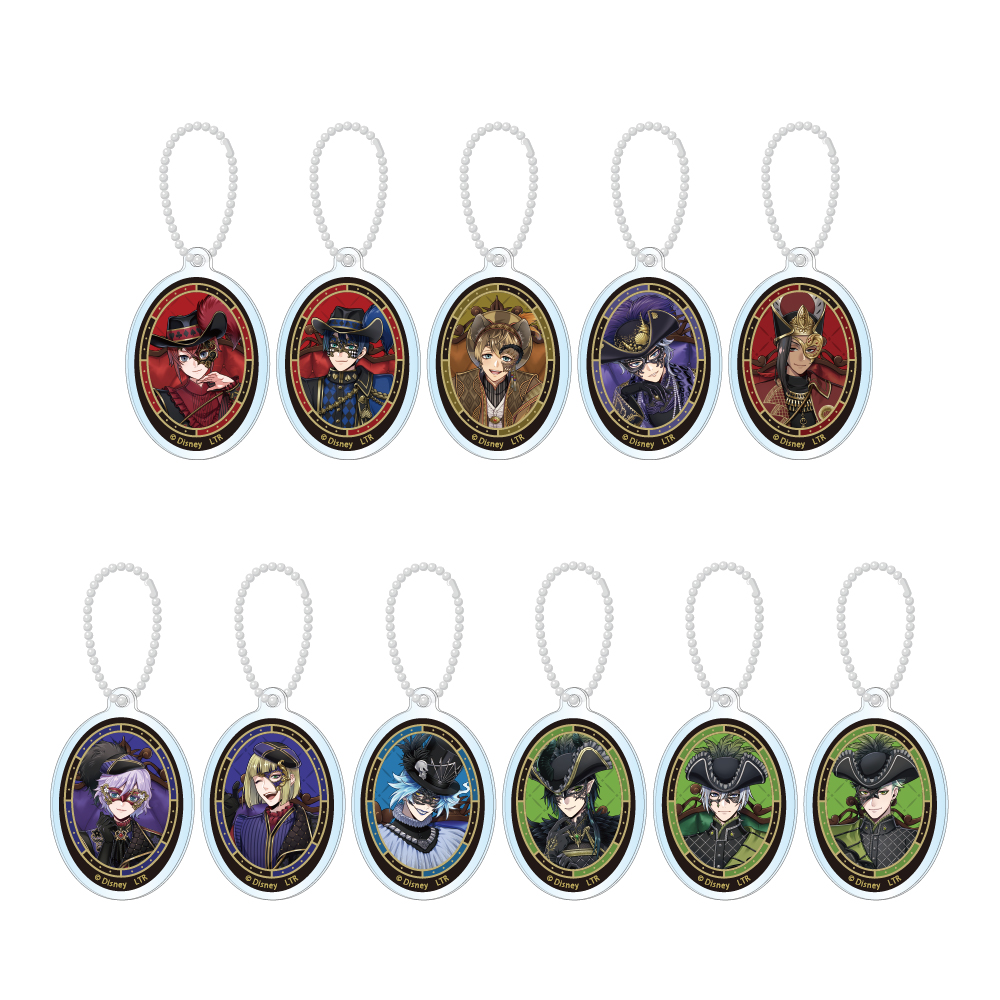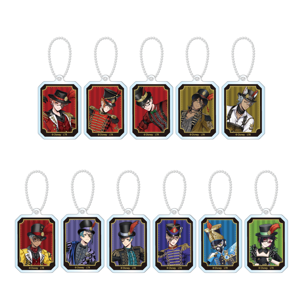 華やかな帽子や仮面をつけた寮生たちをプリントしたアクリルキーホルダー。