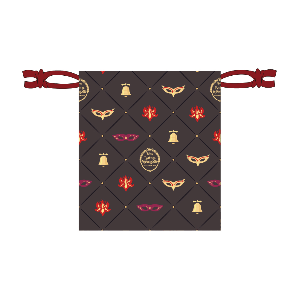 『ノートルダムの鐘』をモチーフにしたイベント「グロリアス・マスカレード〜紅蓮の花と救いの鐘〜」のアイコンを散りばめた巾着。