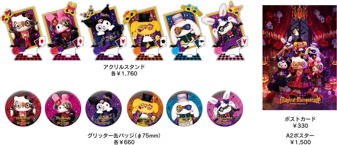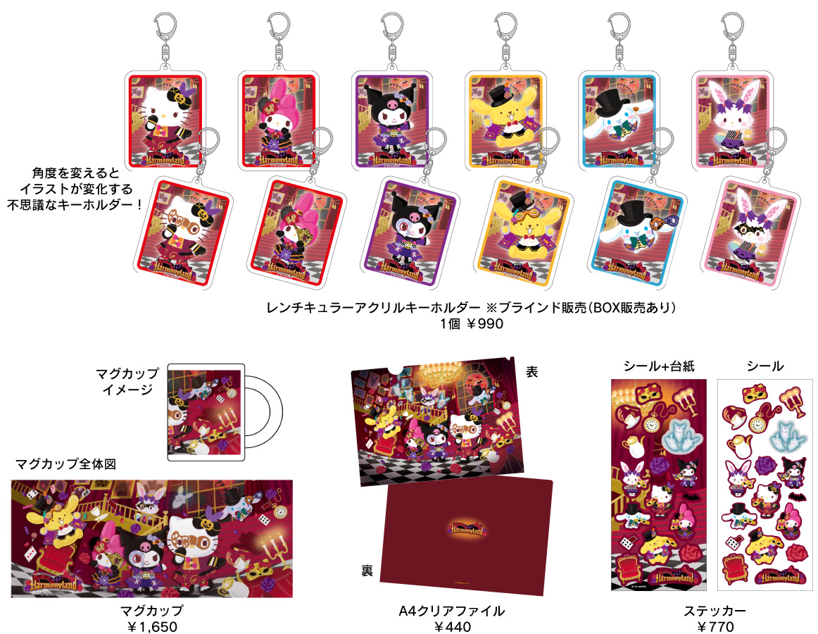 日常でも使いやすい、マグカップやクリアファイルなどのイラストグッズをはじめ、「Harmony Halloween Magical Masquerade」のグッズがたくさん登場します。