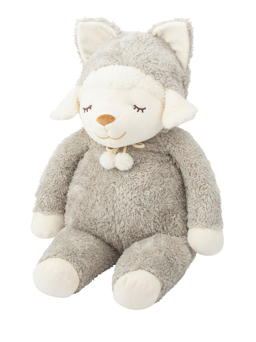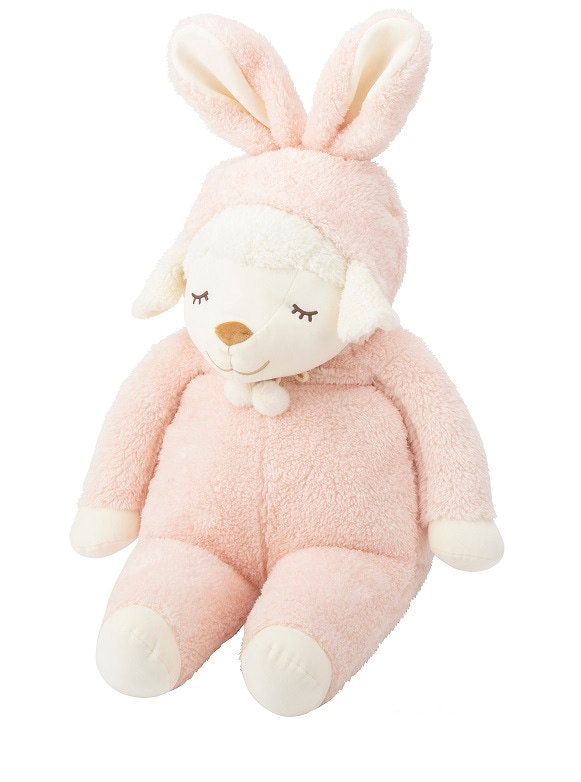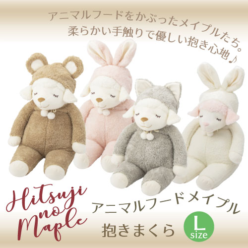 ふわふわ素材と優しい色合いがかわいい、動物の耳付きフードをかぶった「ひつじのメイプル」の抱きまくら!