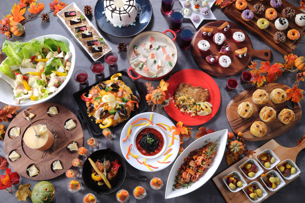 メニュー例:低温調理牛肉の鉄板焼き、串カツ各種、かぼちゃニョッキのミイラパイ、ポークシュニッツェル、秋鮭ときのこのクラムチャウダー、赤インゲン豆のトマト煮いかすみパスタ、ミックスパエリア、いもくりなんきんのレモンマリネ、ロメインレタスとテテドモアンヌチーズのシーザーサラダ、スモークトラウトサーモンマリネと柿のコンフィ、スパイダーシフォン、ミイラのカップケーキ、紫芋のホラーデニッシュ、ハロウィーンマカロンアソート、バタフライピーティー など