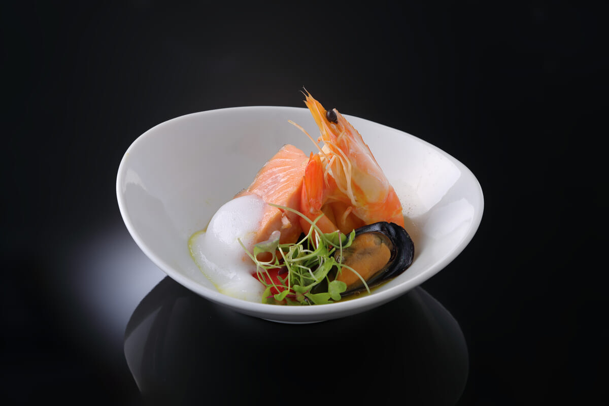 しっとりなめらかな食感に仕上げたアトランティックサーモンに、ブイヤベース風のコクのあるスープがかけてあります。