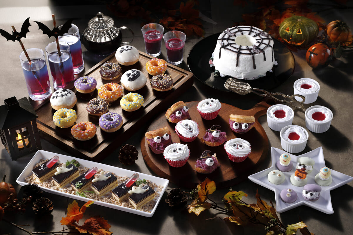 さらにシェフイチオシのハロウィーンスイーツとして、サクサクのデニッシュにほのかな甘みの紫芋クリームをたっぷり詰め込んだ「紫芋のホラーデニッシュ」、ホイップクリームで包帯を表現した「ミイラのカップケーキ」、真っ赤な目が特長的な「目玉プリン」などが登場。