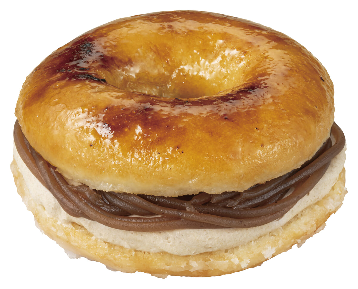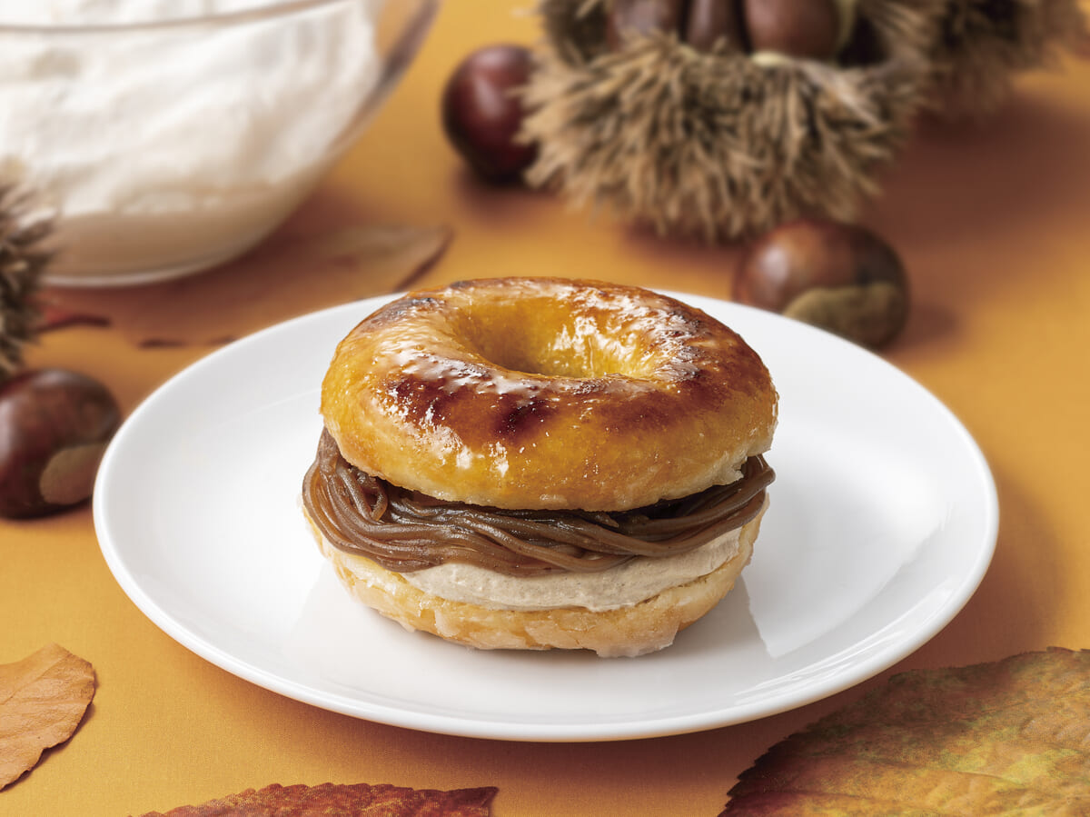 熊本県産渋皮栗のモンブランクリームと、軽いくちどけのマロンホイップクリームをタブルで絞り、贅沢にサンドした秋限定のドーナツ。