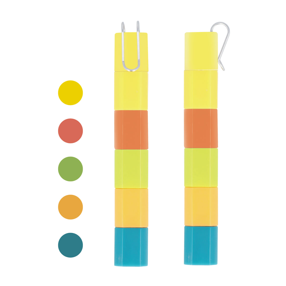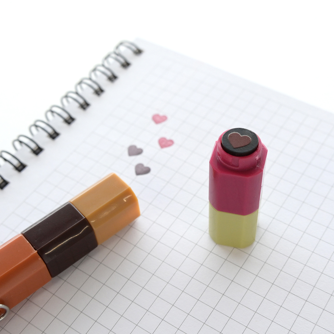 「スティッキールスタンプ」は、丸・四角・ハート・三角の同じデザインのスタンプが5色ずつセットになった、場所を取らないスティック型スタンプ。
