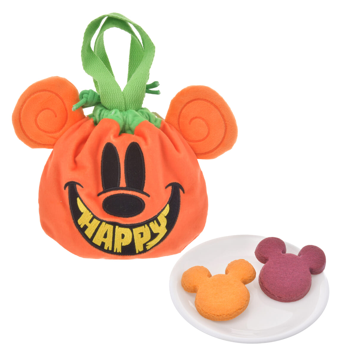 ミッキーアイコン形クッキーが入った、キャラクターをモチーフにしたパンプキンデザインの巾着バッグ。