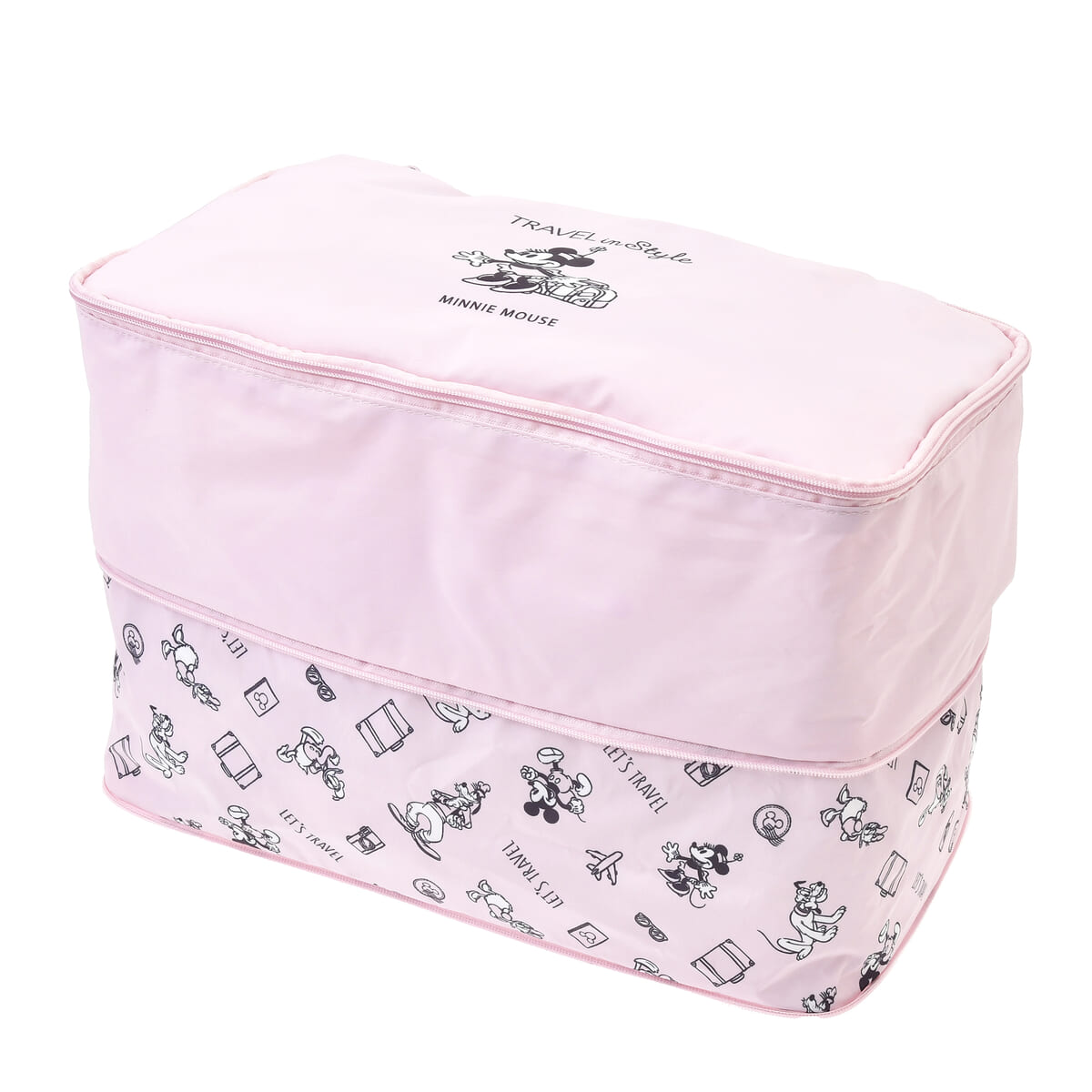 旅する「ミニーマウス」を大きくプリントした、ファスナーを閉めるだけで衣類が圧縮できるポーチのSサイズ。