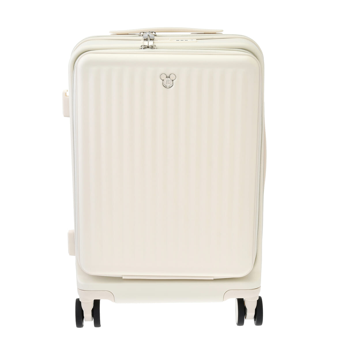 「ミッキーマウス」のお顔をワンポイントであしらった、アイボリーカラーのおしゃれなスーツケース。