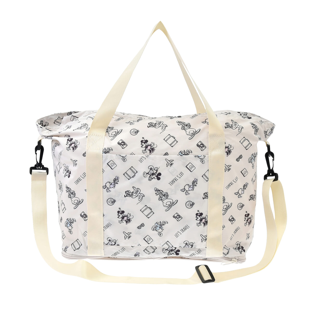 旅する「ミッキー&フレンズ」の総柄デザインを使用した2WAYポケッタブルバッグ。