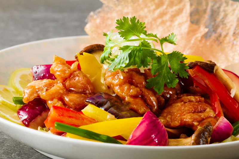 旨味の強い秋鮭を華揚げにし、旬のキノコと特製ソースで炒めています。