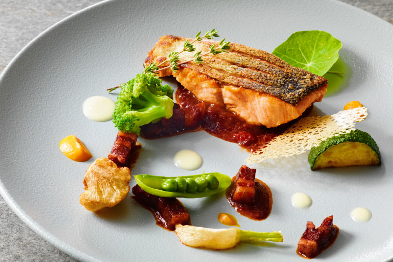 秋鮭のポワレ 赤ワインと北海道産ベーコンのソース