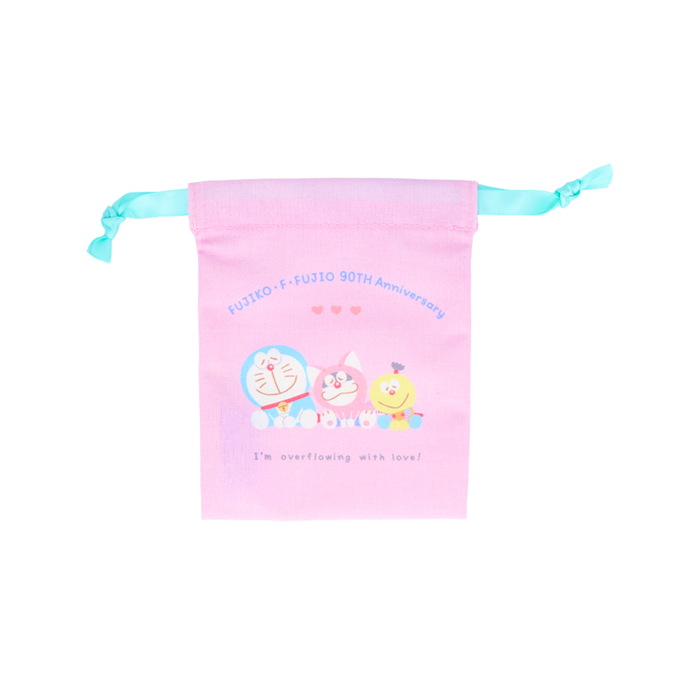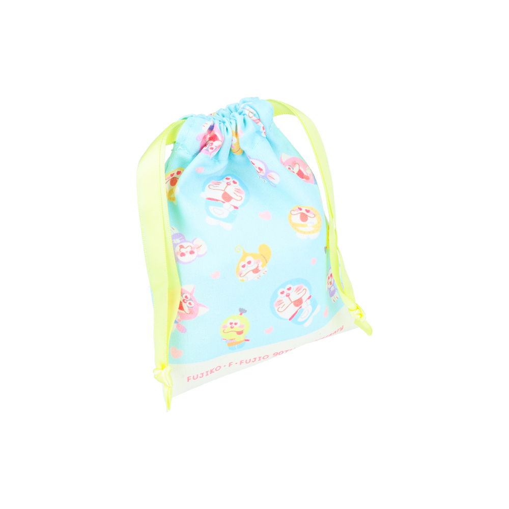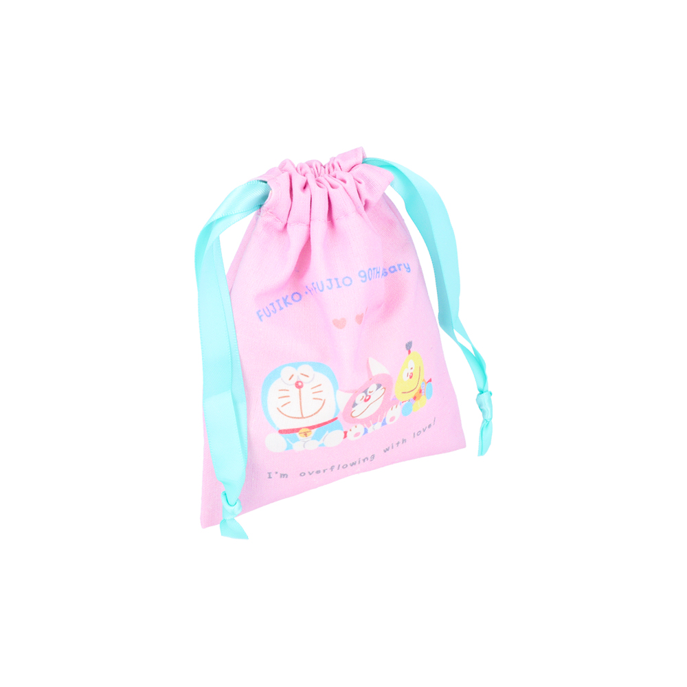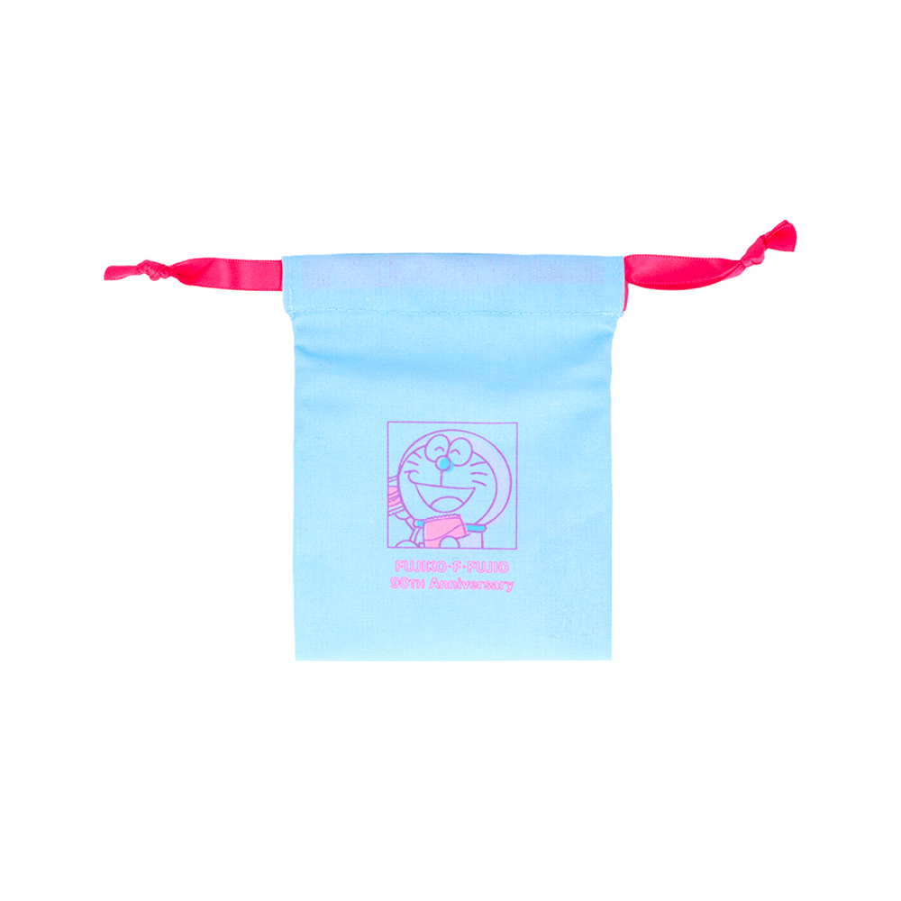 ピンクの巾着に、仲良くもたれかかる「ドラえもん」「ポコニャン」「コロ助」の姿をあしらったデザイン。