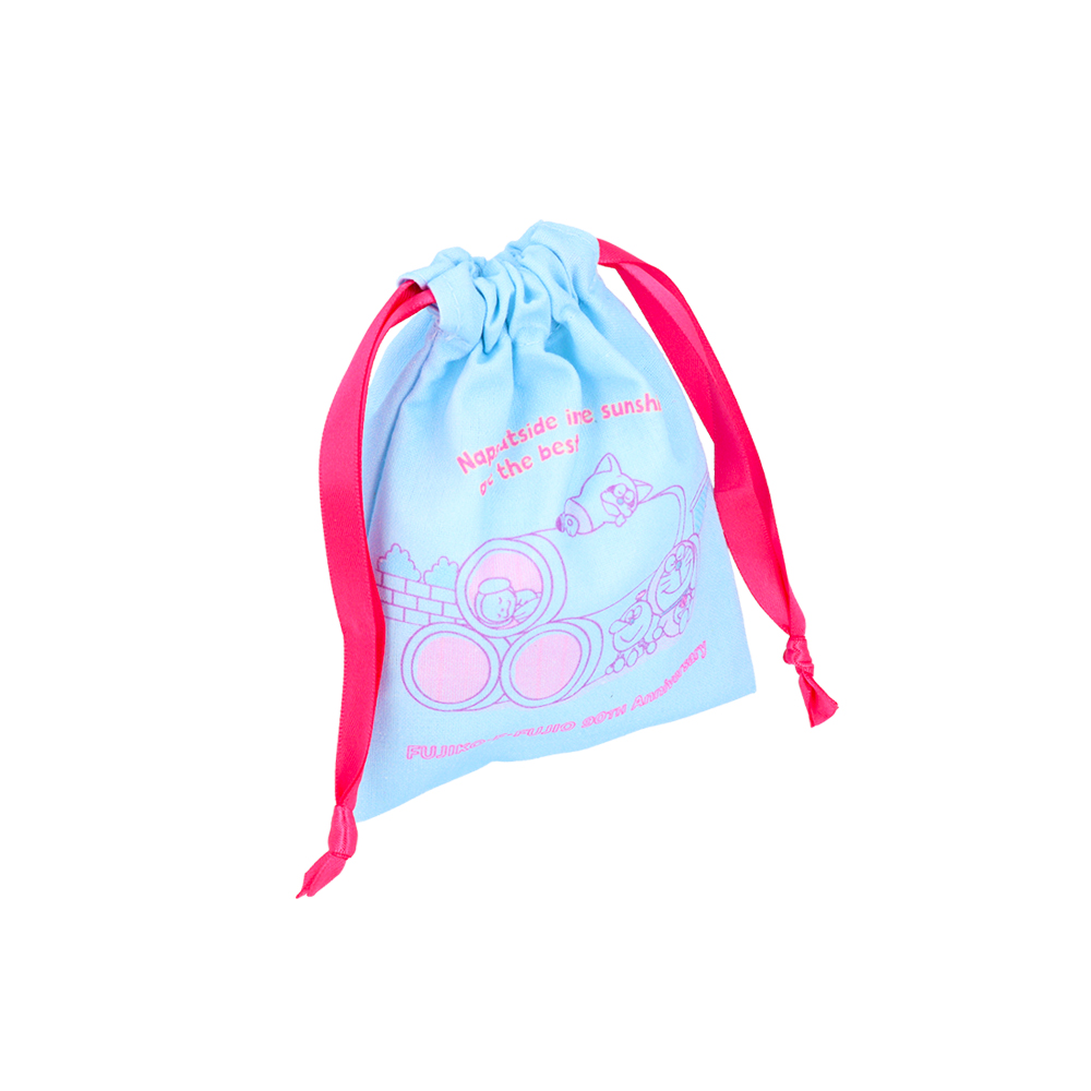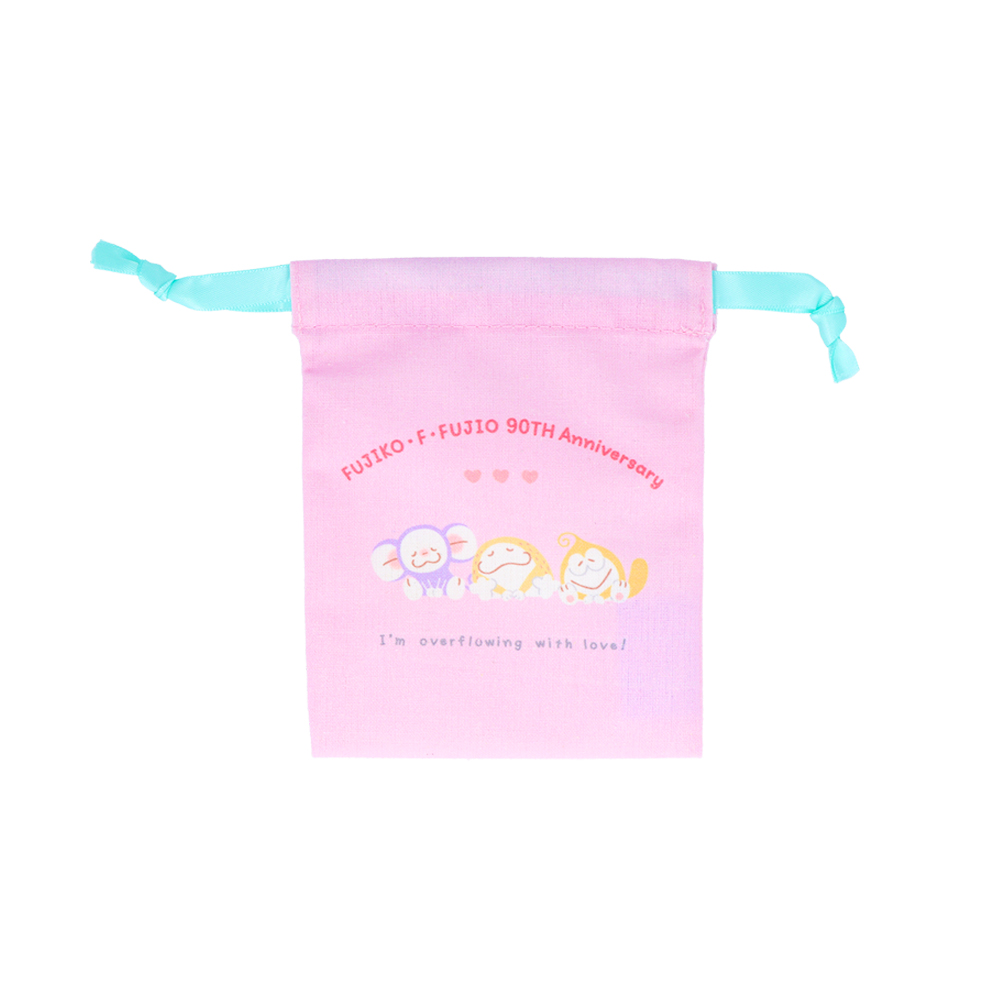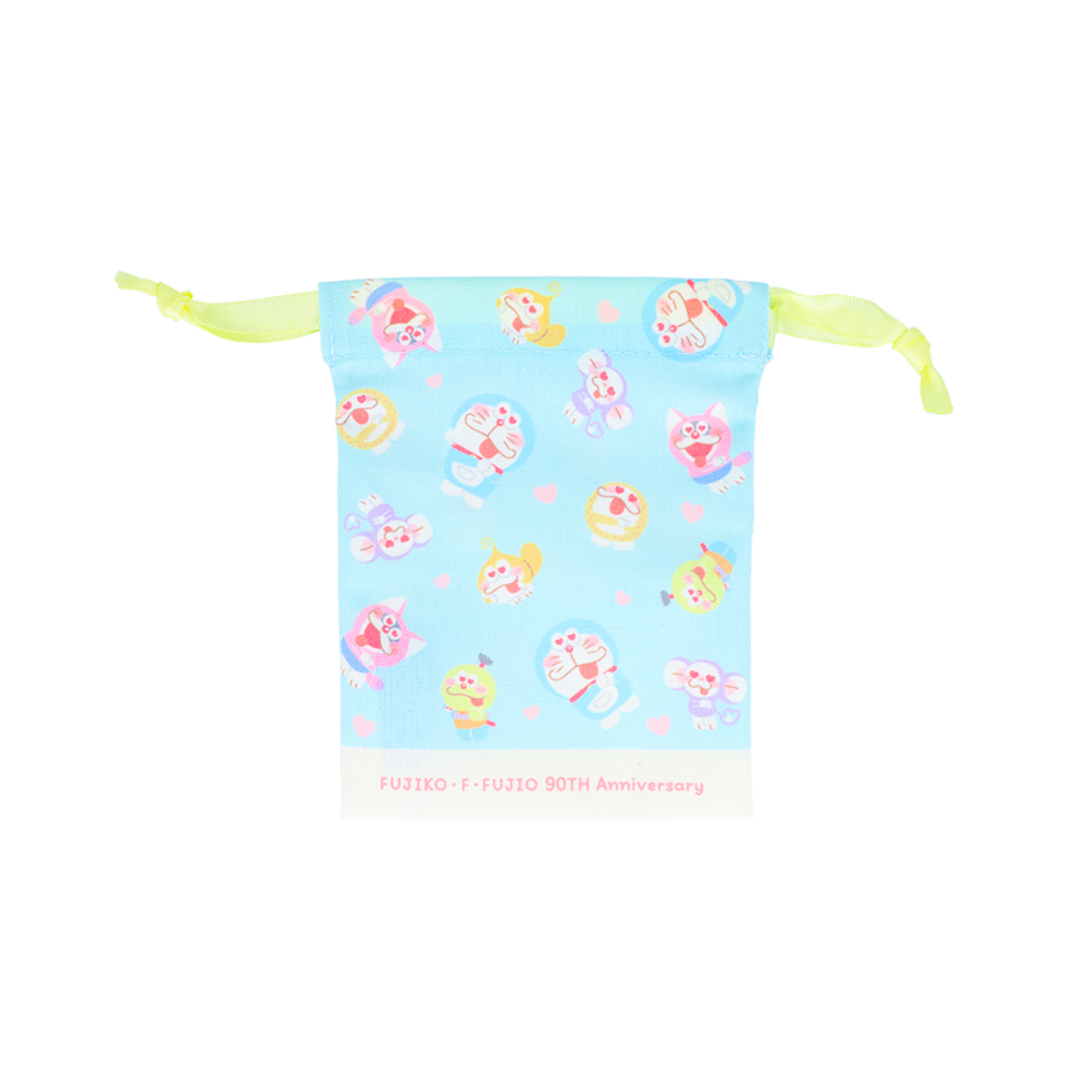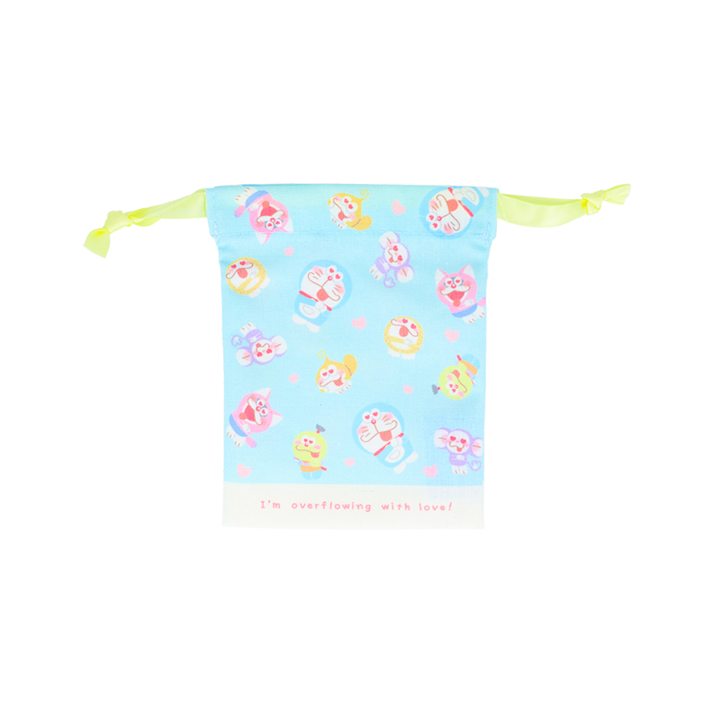 ピンクの巾着に、仲良くもたれかかる「ドラえもん」「ポコニャン」「コロ助」の姿をあしらったデザイン。