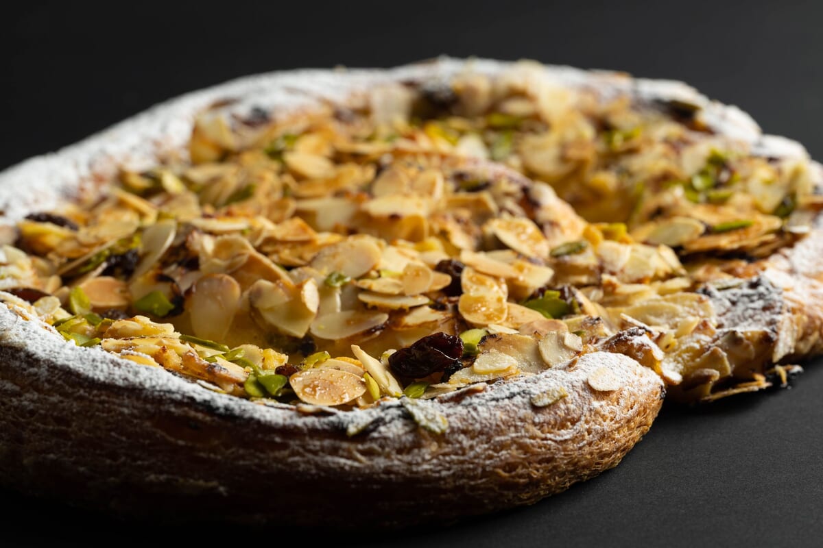 直径30センチと、賑やかなパーティーにぴったりなビッグサイズのデニッシュは、サクサクの生地にカスタードクリーム、ドライレーズンとセミドライアプリコット、ピスタチオをトッピングしています。