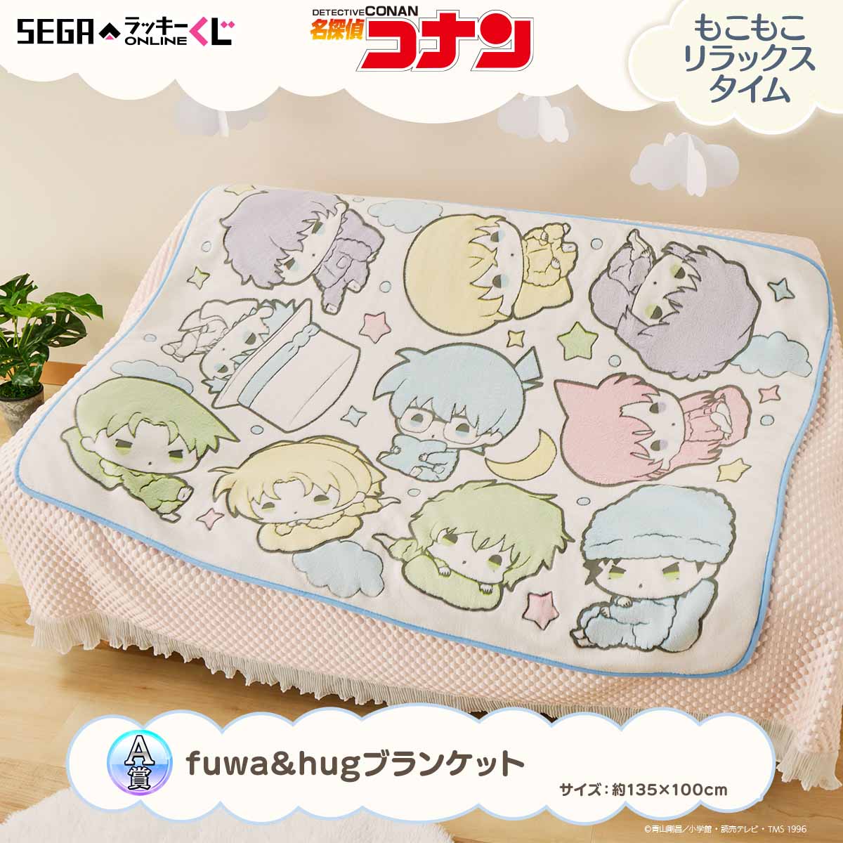 くじには「江戸川コナン」たちがふわふわルームウェア姿になった描き下ろしイラストを使用した景品がラインナップ。