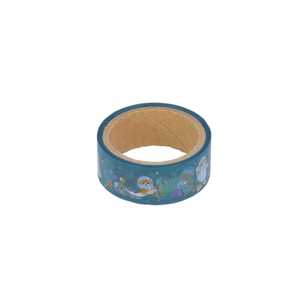 ブルーの透明なマスキングテープに、サメの着ぐるみを来たにゃんこ達が並ぶデザイン。