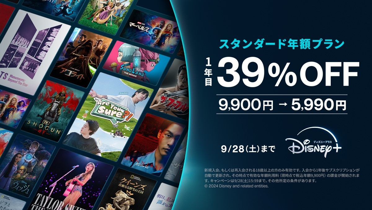 ディズニープラスへ新規加入された方を対象にした、通常9,900円の「スタンダード年額プラン」が特別料金5,990円で提供される期間限定割引キャンペーンを実施。