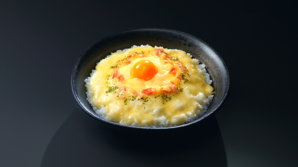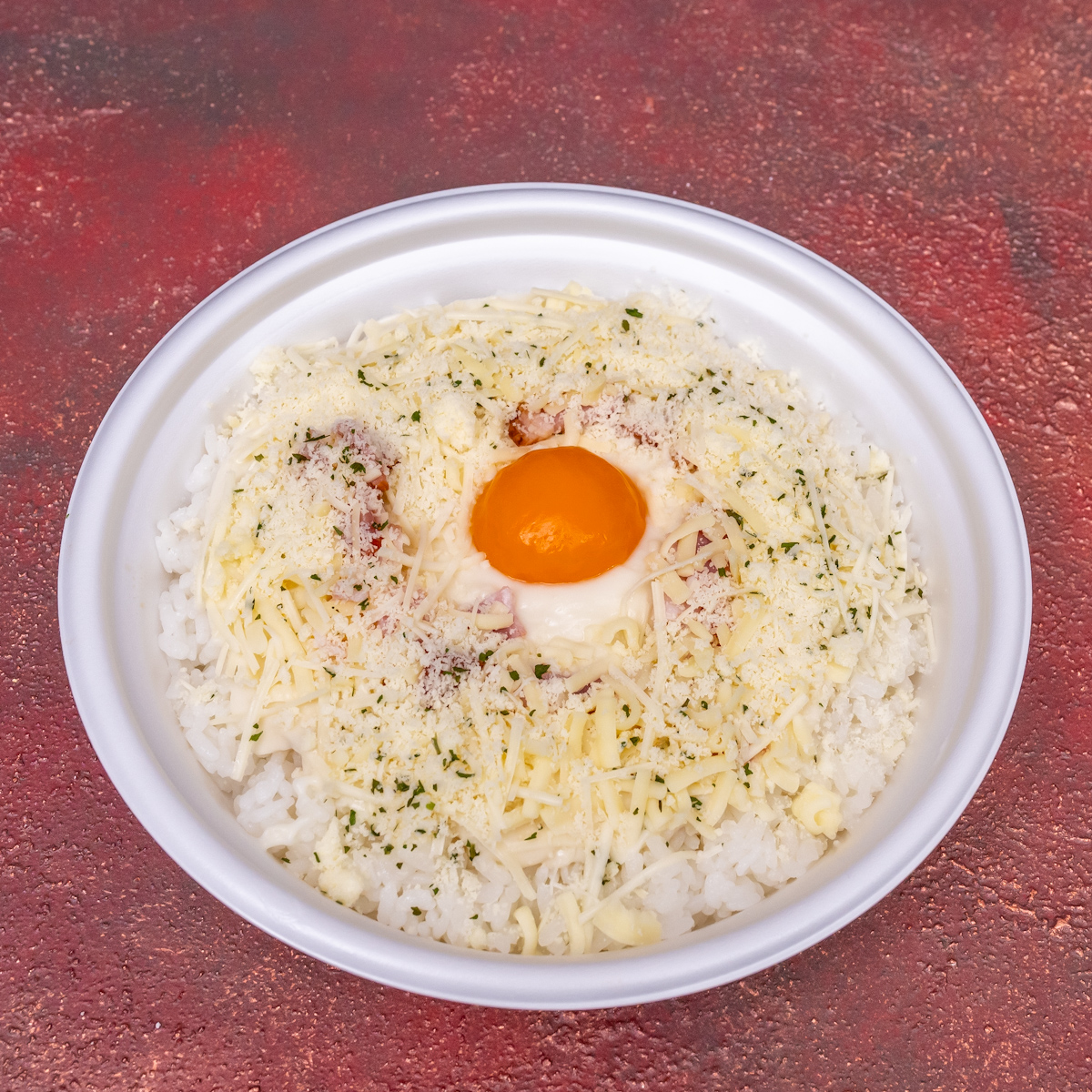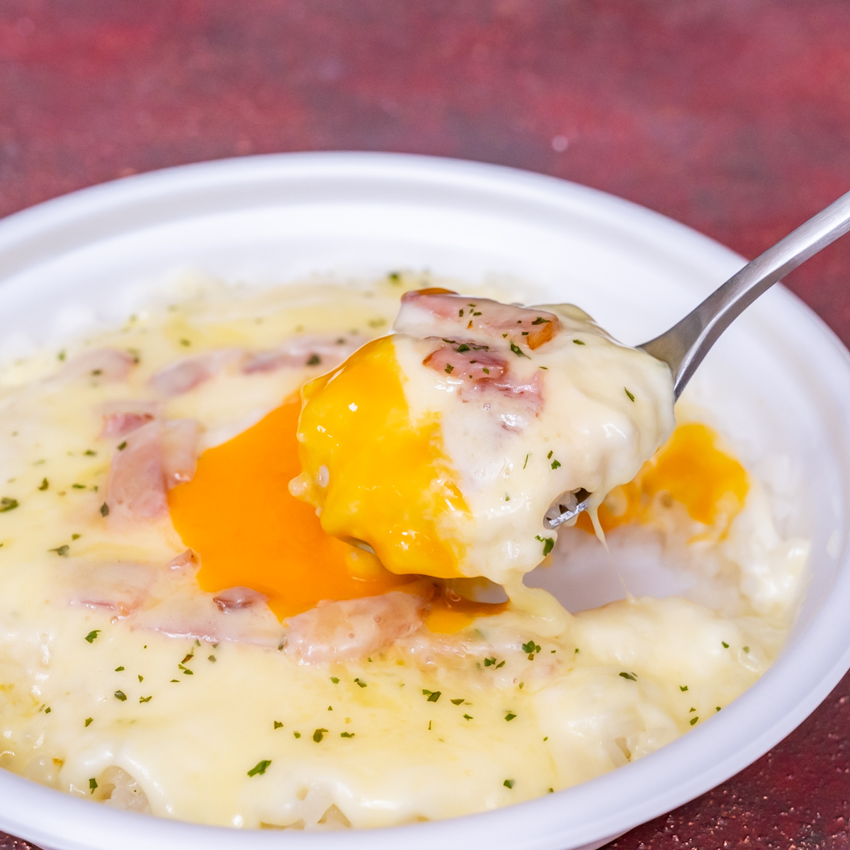 ごはんの上にチーズ入りの濃厚なホワイトソースをのせ、さらに上からたっぷりのチーズをトッピングした「チーズに溺れる濃厚カルボナーラ風ライス」