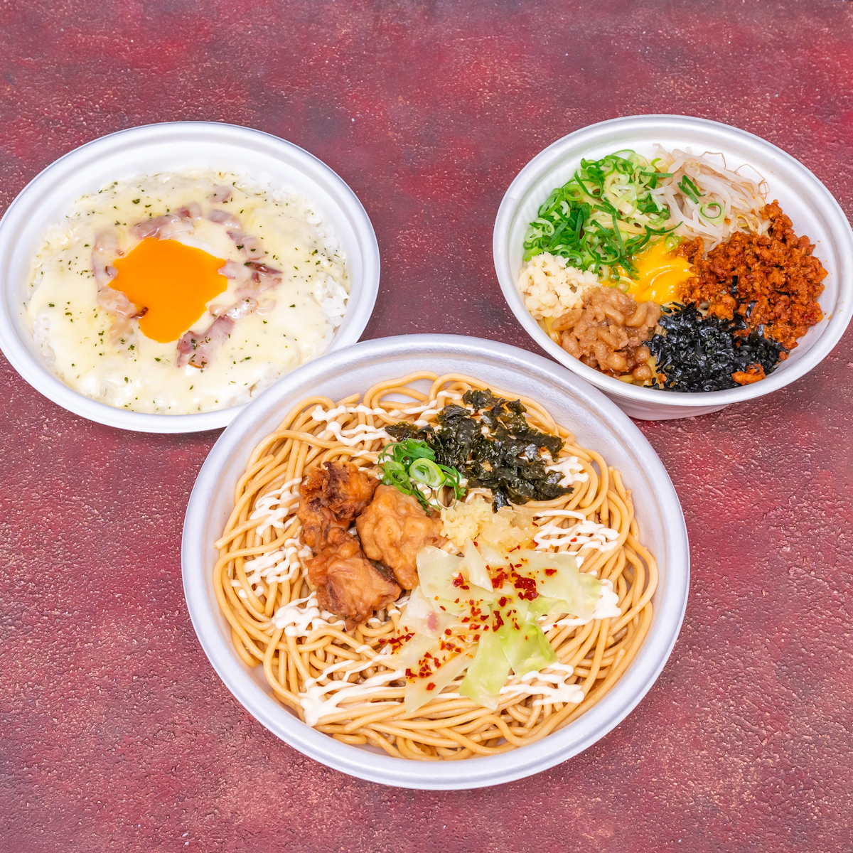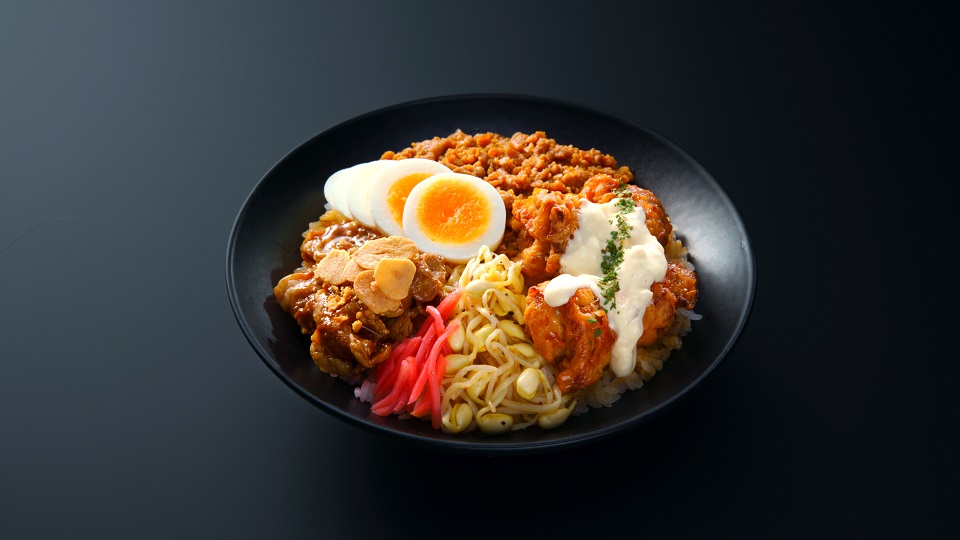 甘く味付けしたそぼろに、タルタルソースをかけた鶏から揚げ、にんにくを効かせた醤油ダレで味付けした豚焼肉にはフライドガーリックをのせています。