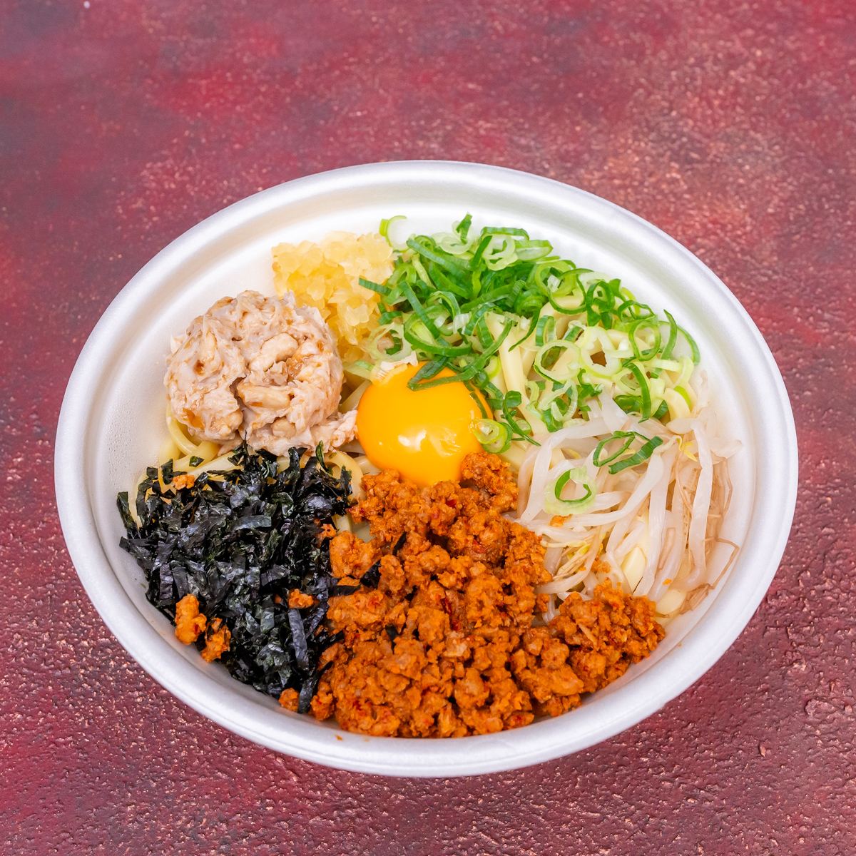 中太の中華麺に、醤油ベースのピリ辛専用ダレを合わせ、肉そぼろ炒め・青ねぎ・卵黄ソース・刻み海苔・もやし・煮干し粉末をトッピングしています。