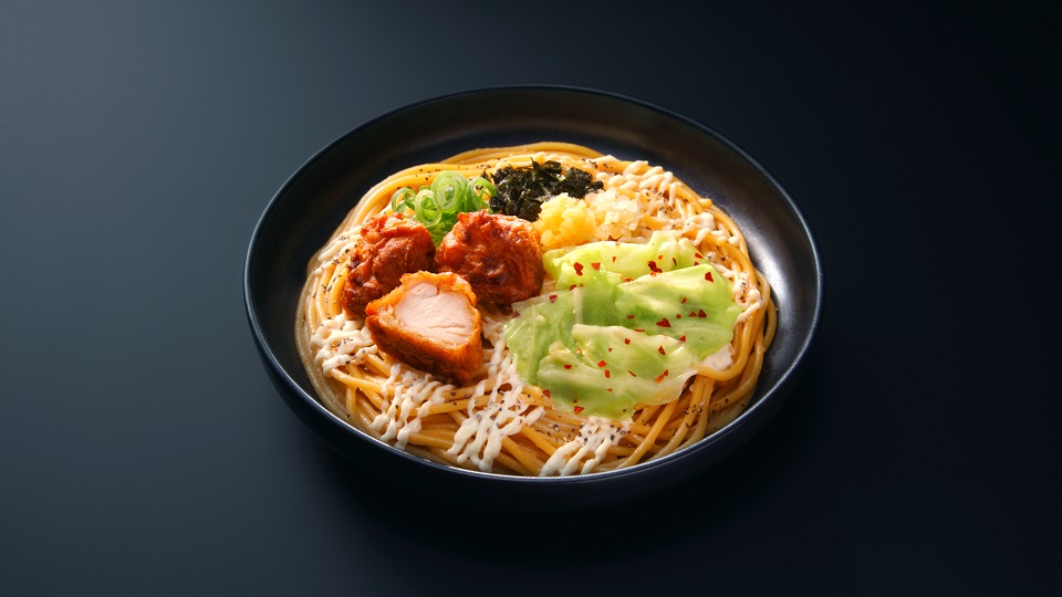 「大盛 から揚げとにんにく背脂醤油マヨパスタ2」は、にんにくを効かせ、背脂を加えた醤油仕立ての大盛パスタです。