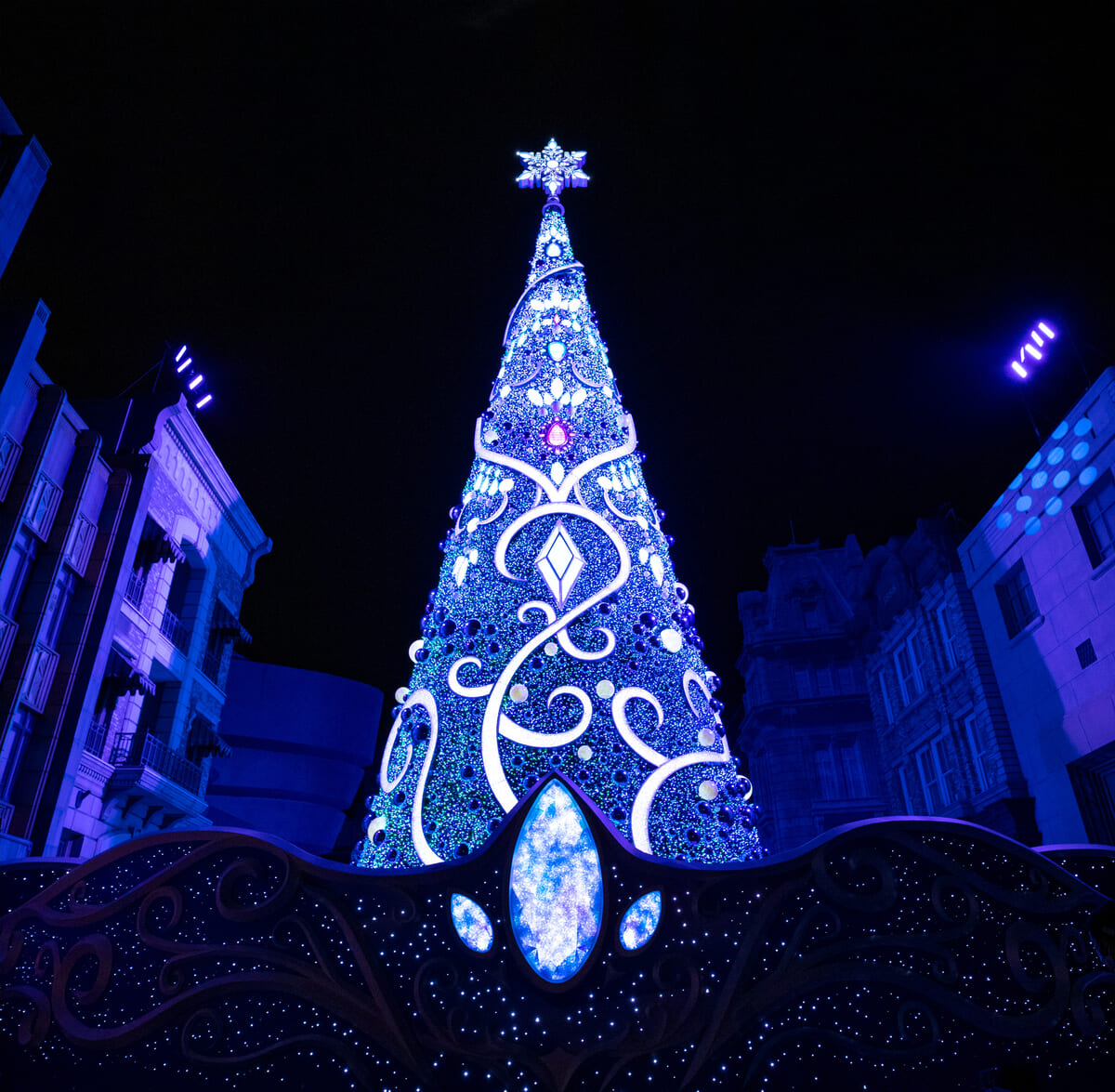 なかでも、エントランスから真正面に見える、ニューヨーク・エリアにそびえ立つ30mを超える巨大なツリーは、入場したゲストのクリスマス気分を大いに盛り上げ、圧倒的な美しさでパークの冬を演出。