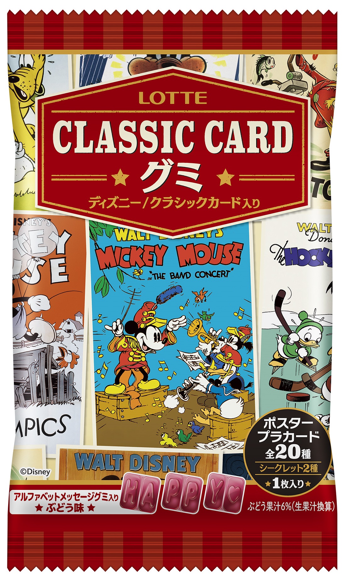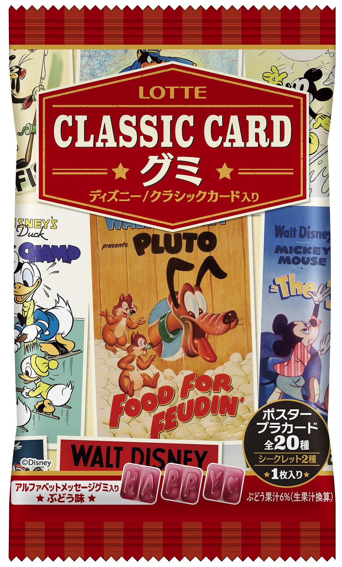 アルファベット型がかわいいぶどう味のグミと、ついつい集めたくなる、レトロかわいい、クラシックなディズニーアートが描かれたカードが1枚入っています☆