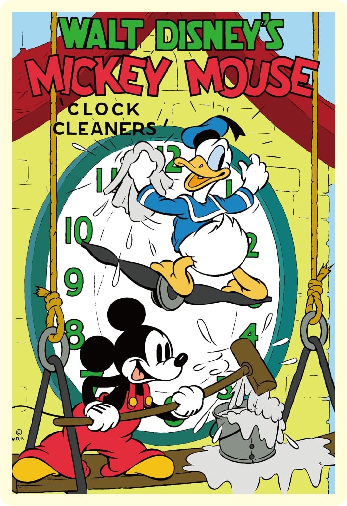 大きな時計をお掃除する「ミッキーマウス」と「ドナルドダック」