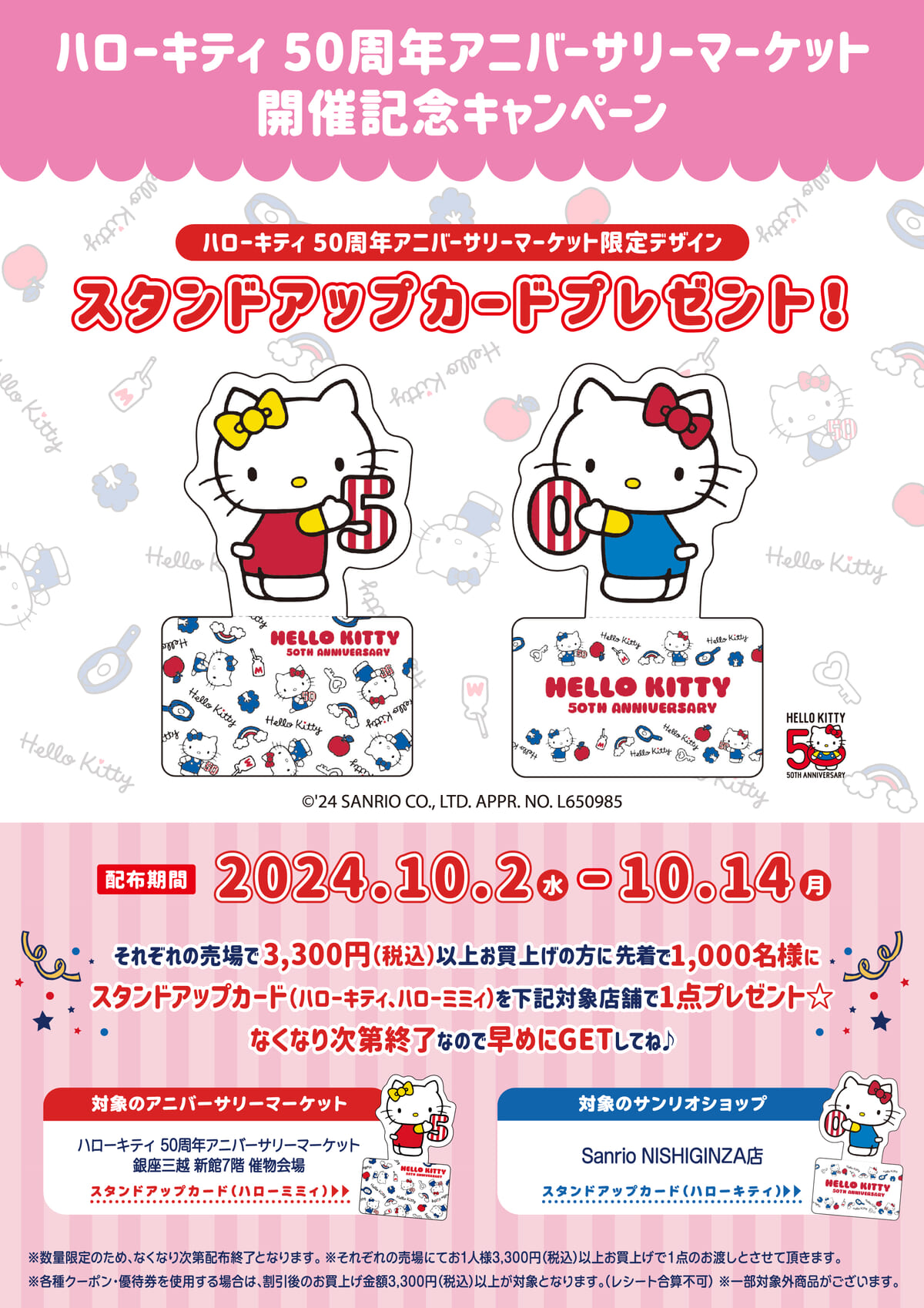 期間中、対象店舗にてグッズを3,300円以上購入された先着1,000名にHello Kitty 50th Anniversary Market限定デザイン「スタンド アップカード」を1枚プレゼント。