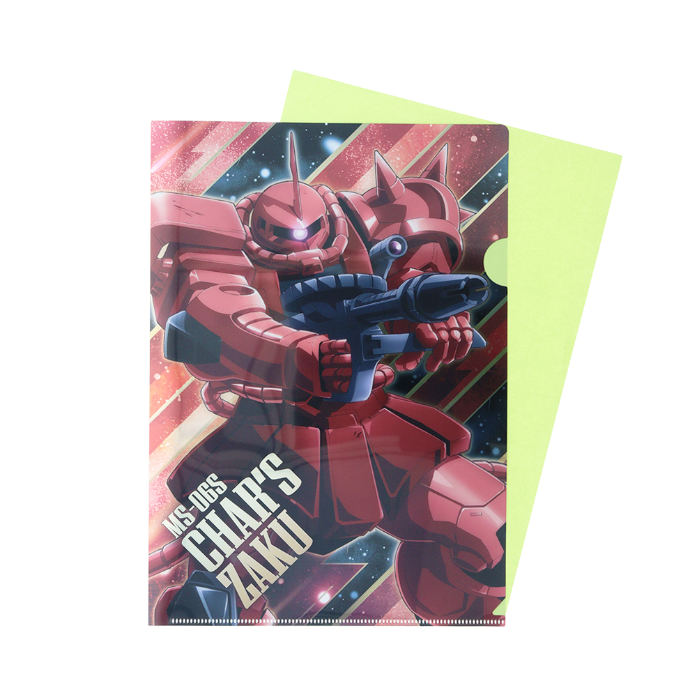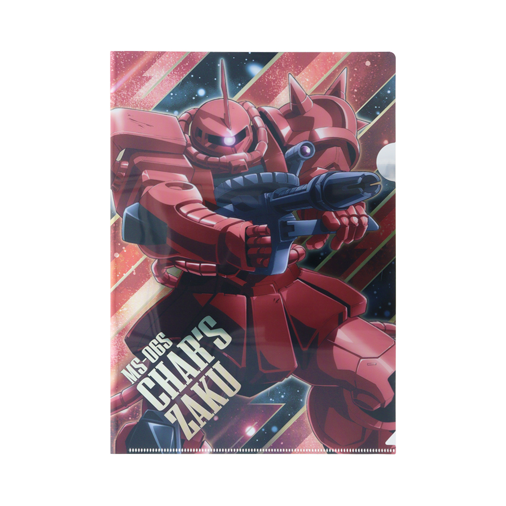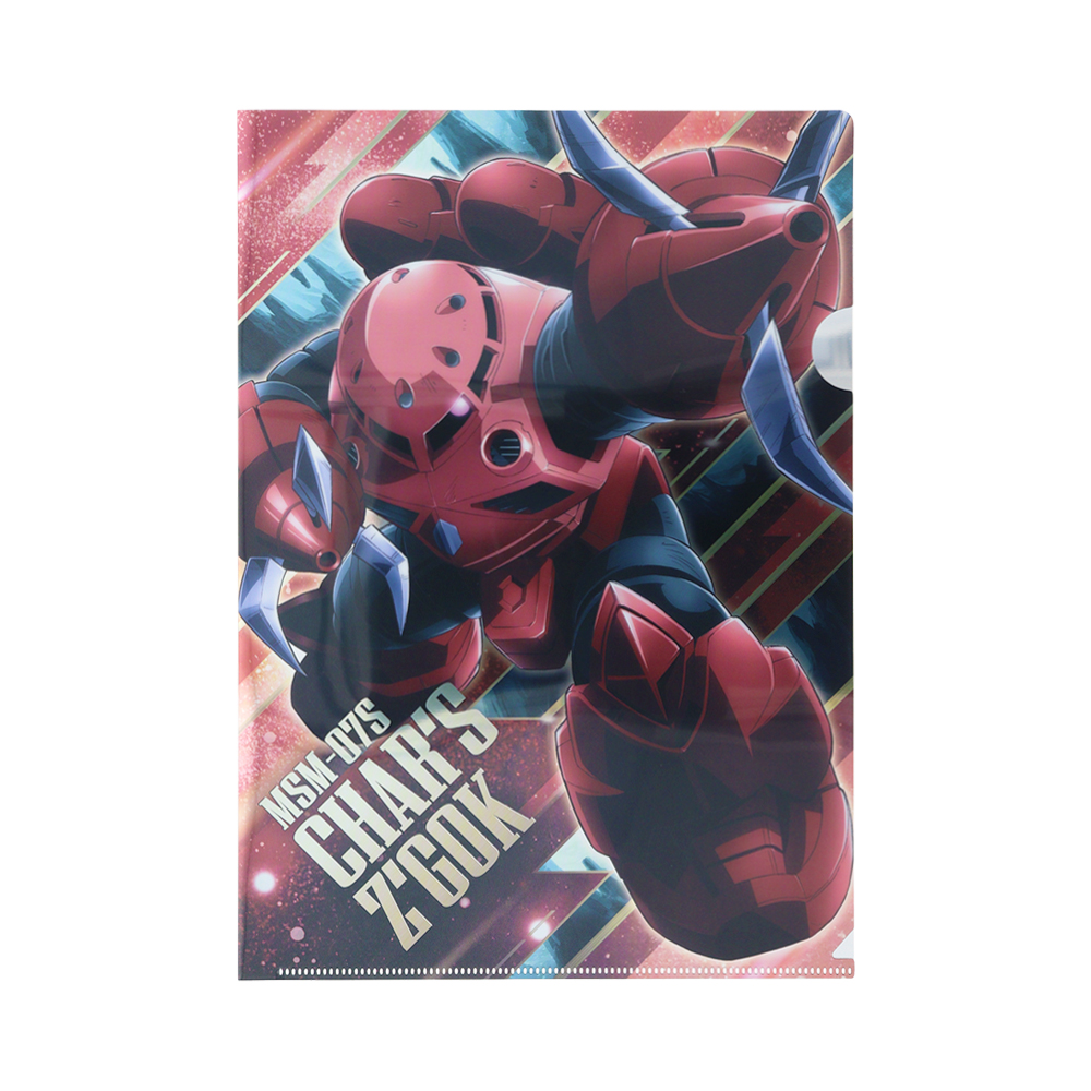 輝きのあるメタリック仕様のクリアファイルは、「シャア・アズナブル」と彼の専用機デザインで、4種類がラインナップ。