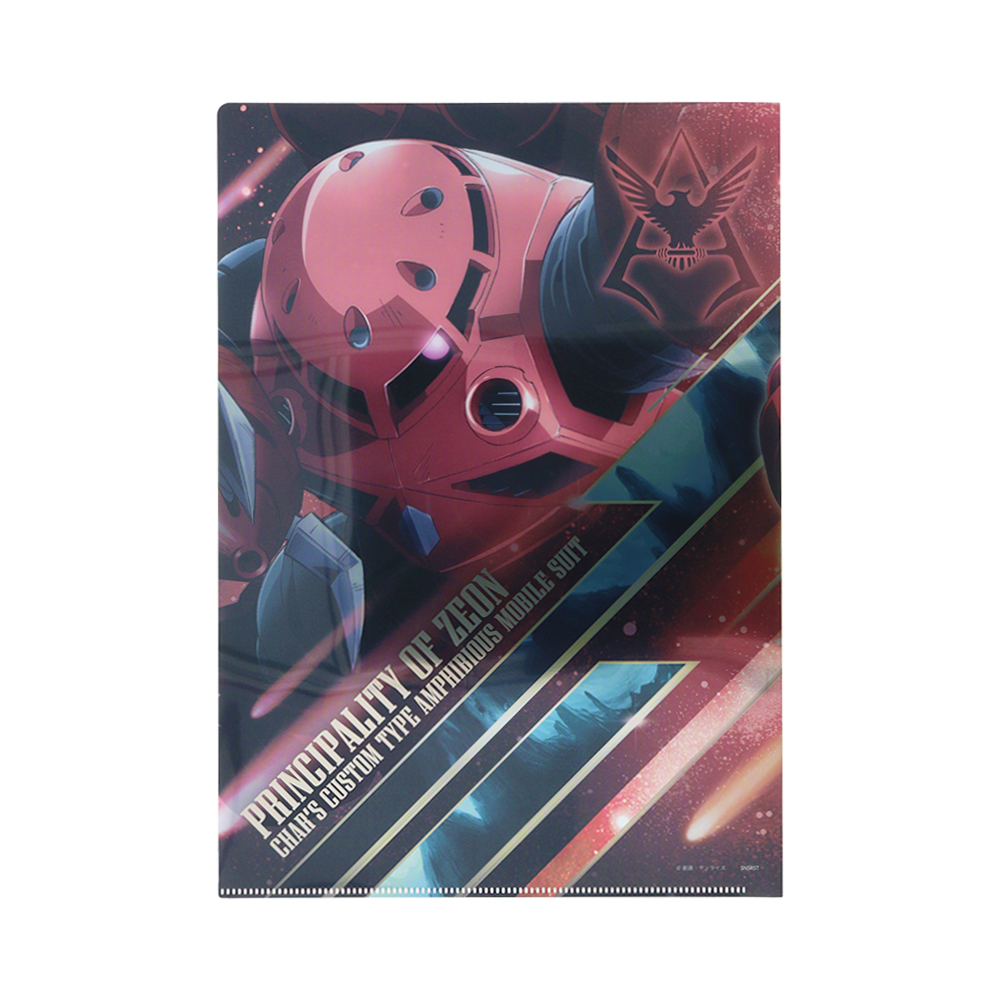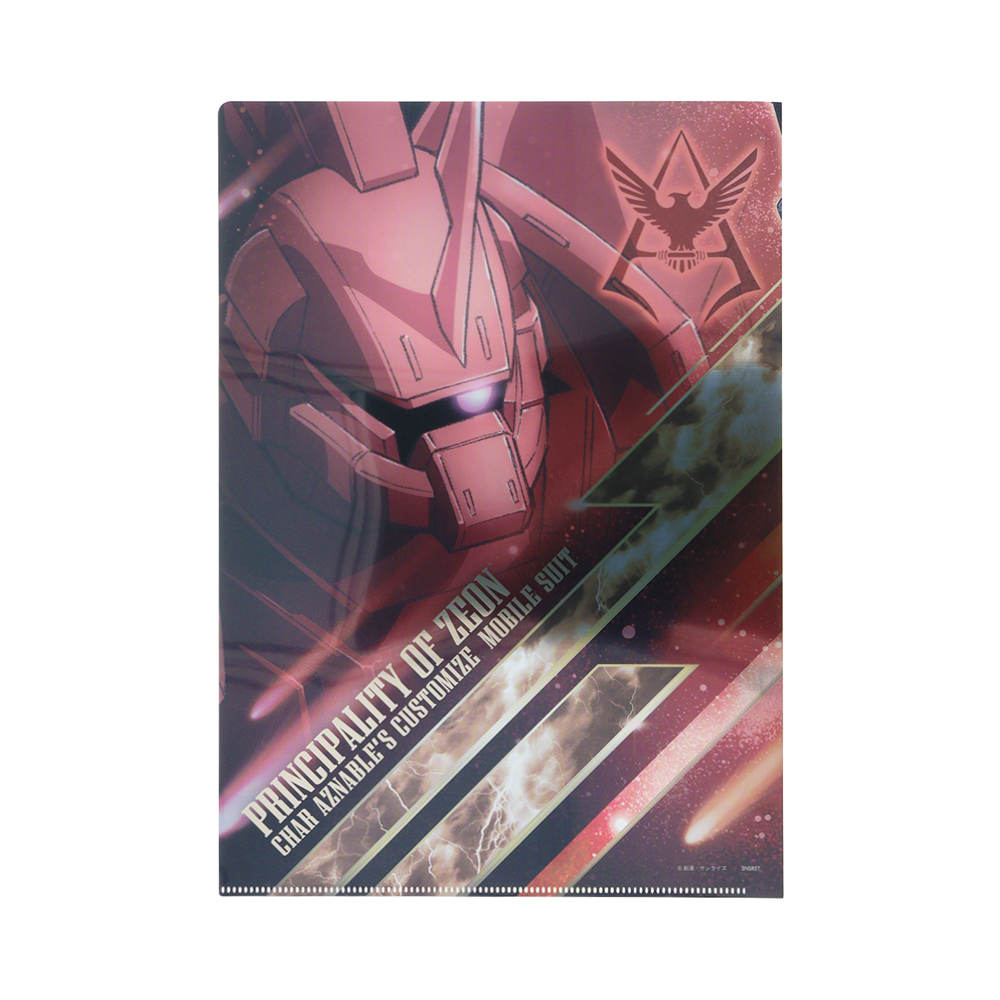 「シャア・アズナブル」と、その後ろに彼専用モビルスーツが並ぶメタリッククリアファイル。