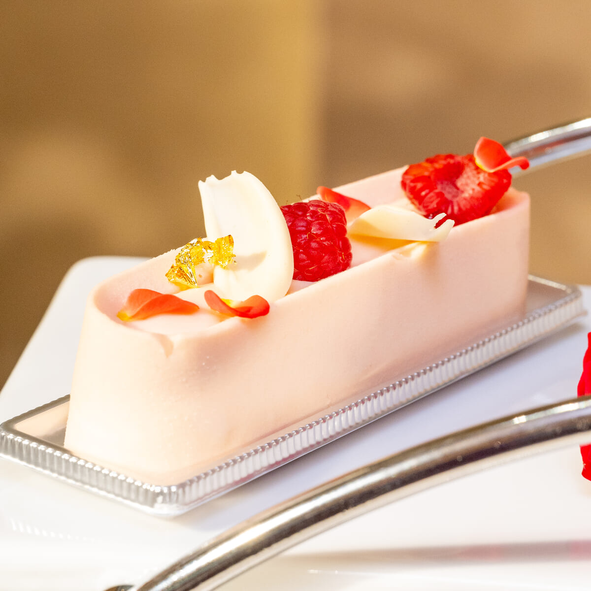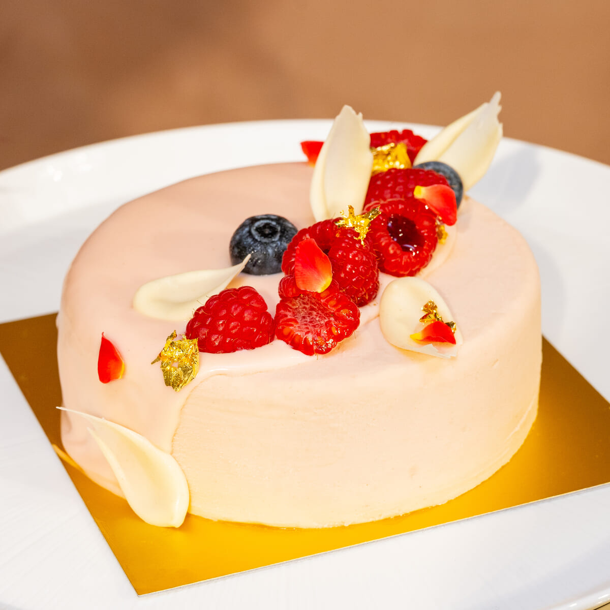 中にはなめらかなライチとホワイトチョコレートのムースを忍ばせた、見た目も華やかな「ドーレ」リニューアルオープンのアニバーサリーケーキです。
