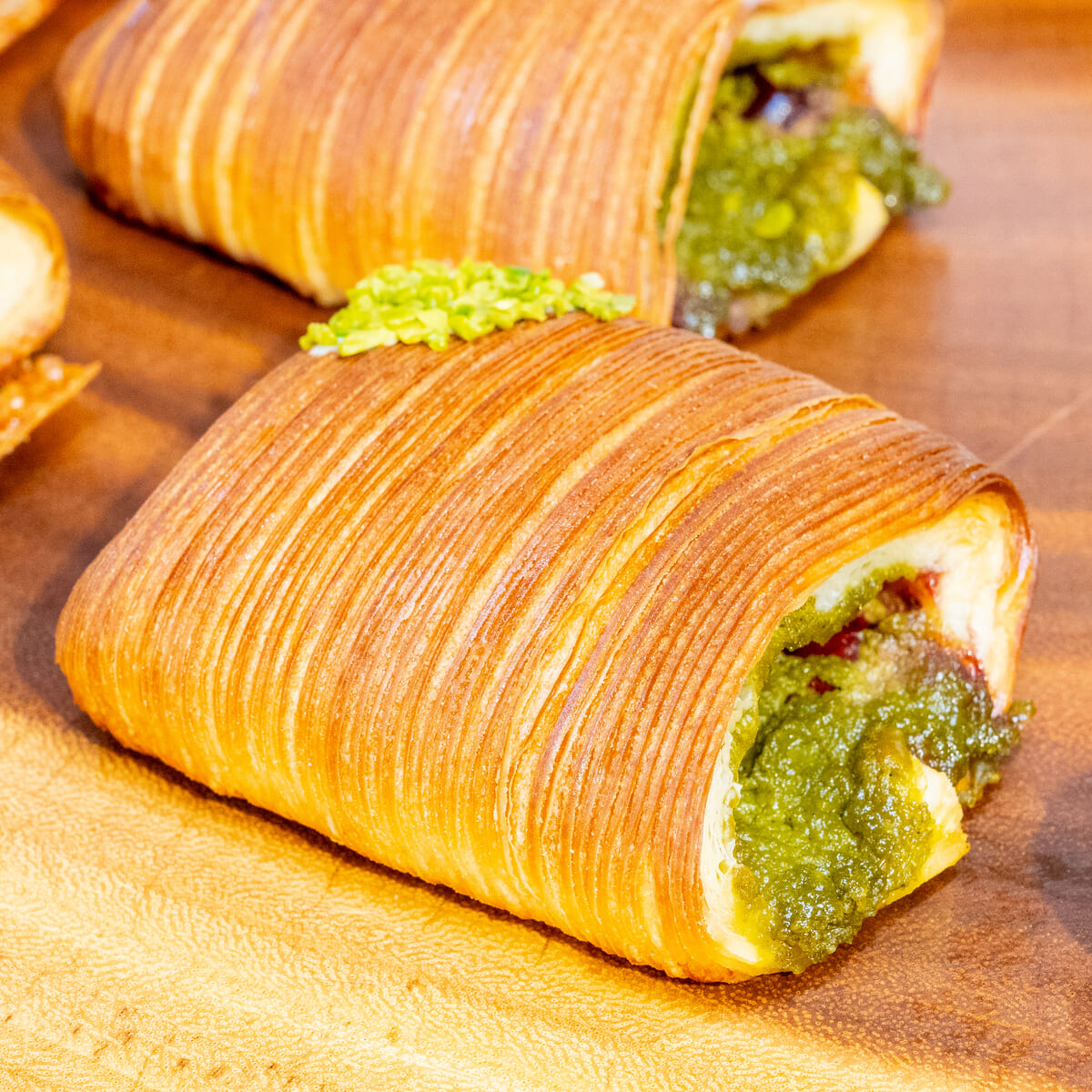 パリパリとした食感の生地に、濃厚なピスタチオクリームと甘酸っぱいチェリーが絶妙にマッチした「ピスタチオクリームとチェリーのパンスイス」