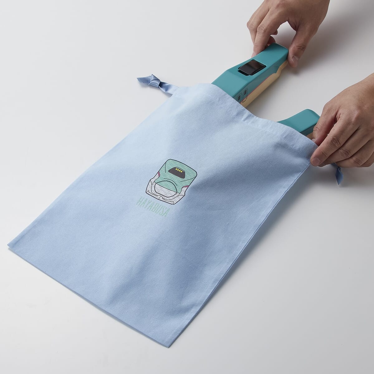 先頭車両と中間車両をセットで購入すると、はやぶさセットのお片付け収納にも使える「はやぶさデザインの巾着」がもらえます!