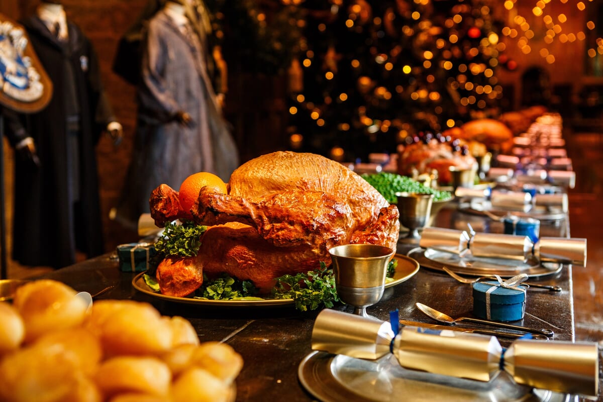 また、生徒たちが食事をする長いダイニングテーブルには、七面鳥や果物、ケーキやクリスマスプディングなどのイギリスの伝統的なごちそうが並び、クリスマスムードを一層盛り上げます。