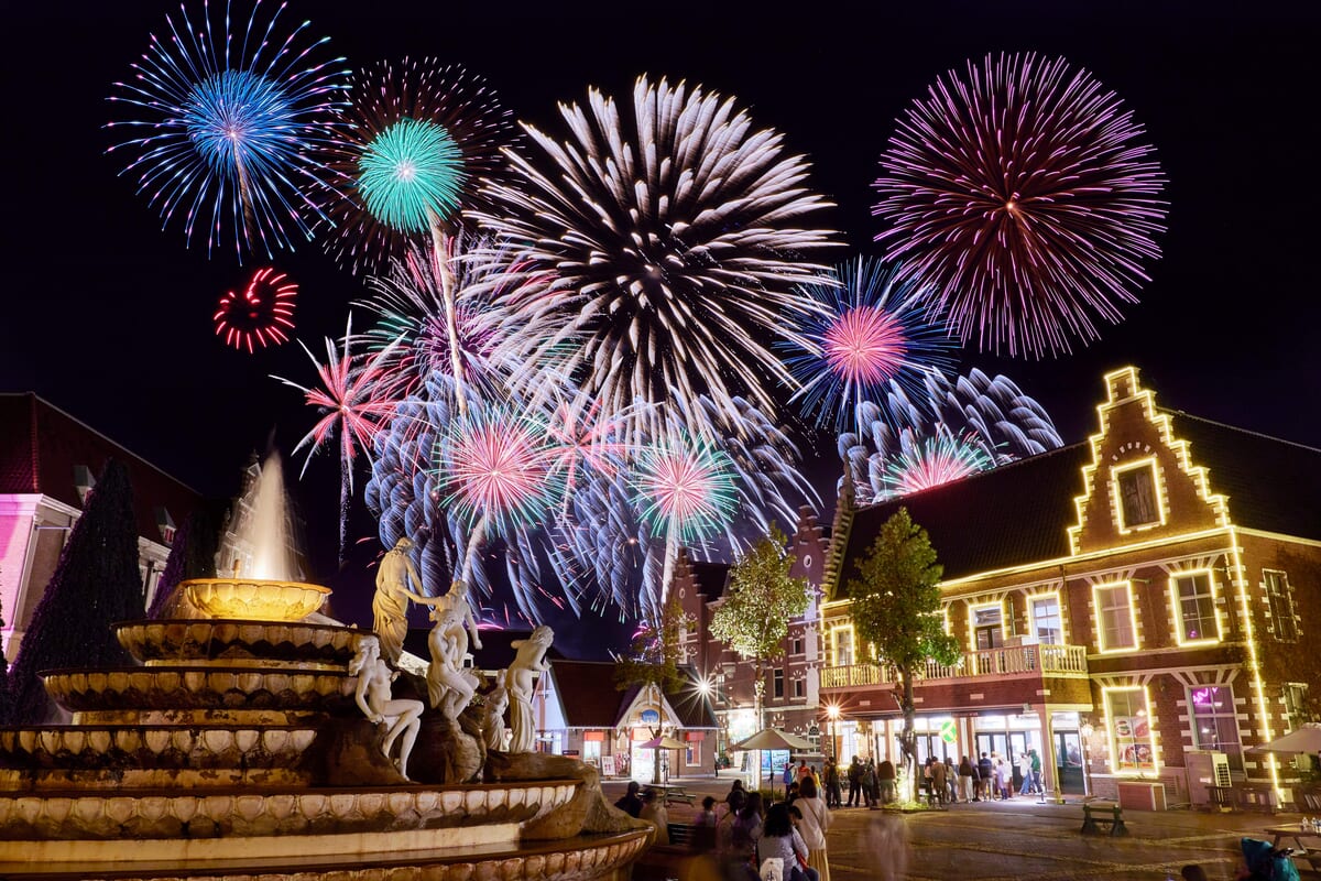 日本最大8,000発の花火が打ち上がり、日本一のイルミネーションが煌めく本物のヨーロッパの街並みには、カウントダウンに合わせてムービングライトの演出が登場。
