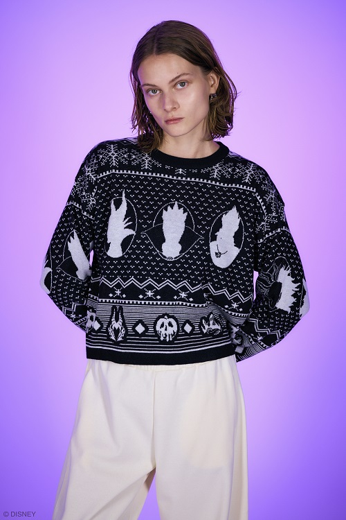 また『アラジン』(1992)の「ジャファー」や『ピーター・パン』(1953)の「フック船長」も加えてシルエットでディズニーヴィランズたちを表現した総柄ジャカードニットも登場します。