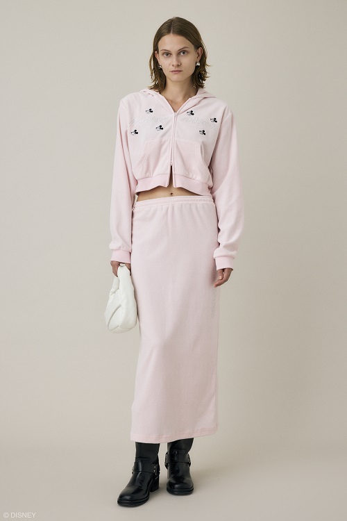 90sテイスト溢れるベロアのセットアップには、ラインストーンや刺繍で「ミッキーマウス」を表現。