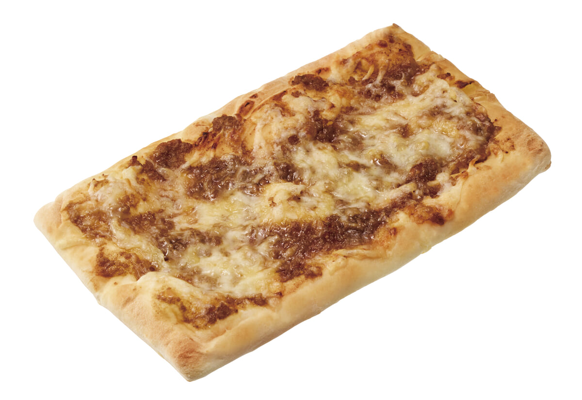 もち粉を加えたもちもち食感の四角いピザ生地に、ほんのり五香粉(ウーシャンフェン)の香る肉みそがトッピングされています。