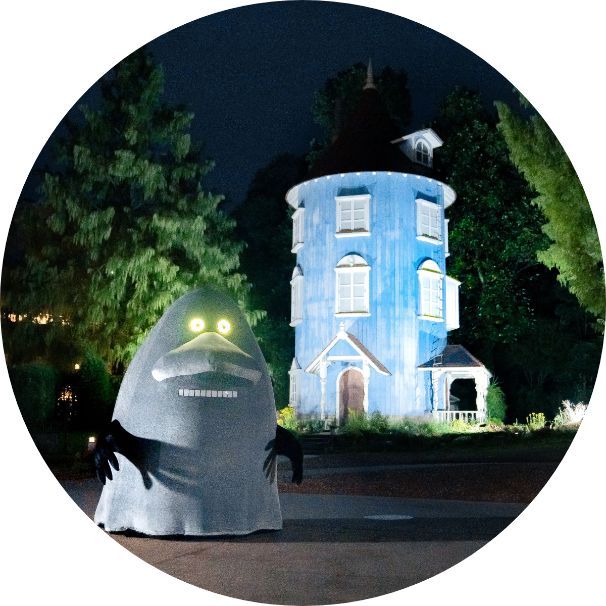 色とりどりの光が木々を優雅に照らし出し、表情を変えながらムーミン谷エリアを幻想的に彩ります。