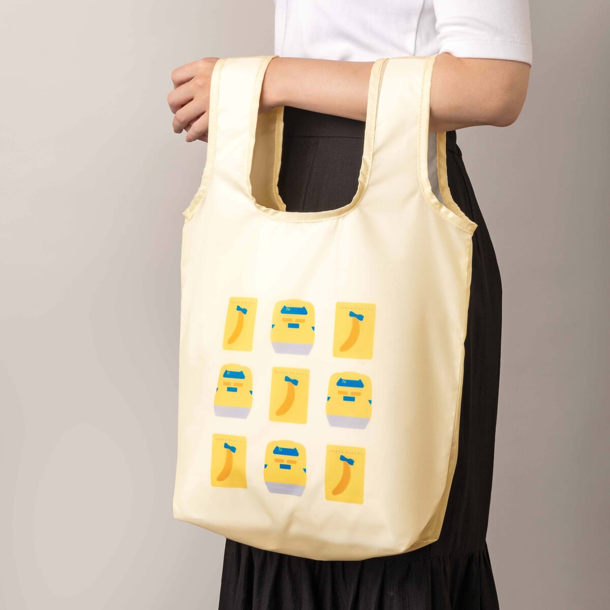 東京ばな奈のロゴとドクターイエローが交互に並ぶデザインがとってもかわいい「【幸せの黄色見ぃつけたっ】東京ばな奈×ドクターイエローコラボバッグ」