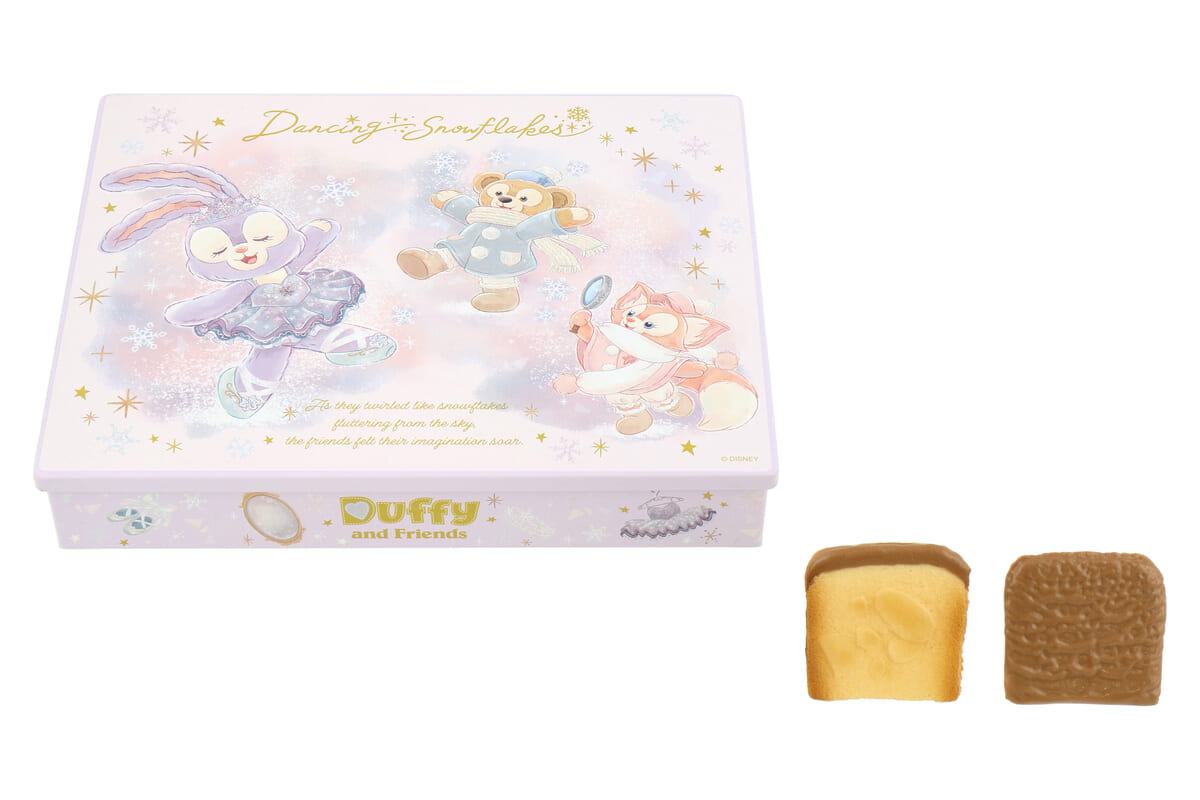 雪の結晶のダンスを踊る「ステラ・ルー」と「ダッフィー」「リーナ・ベル」がデザインされたパッケージのアソーテッド・クッキー。