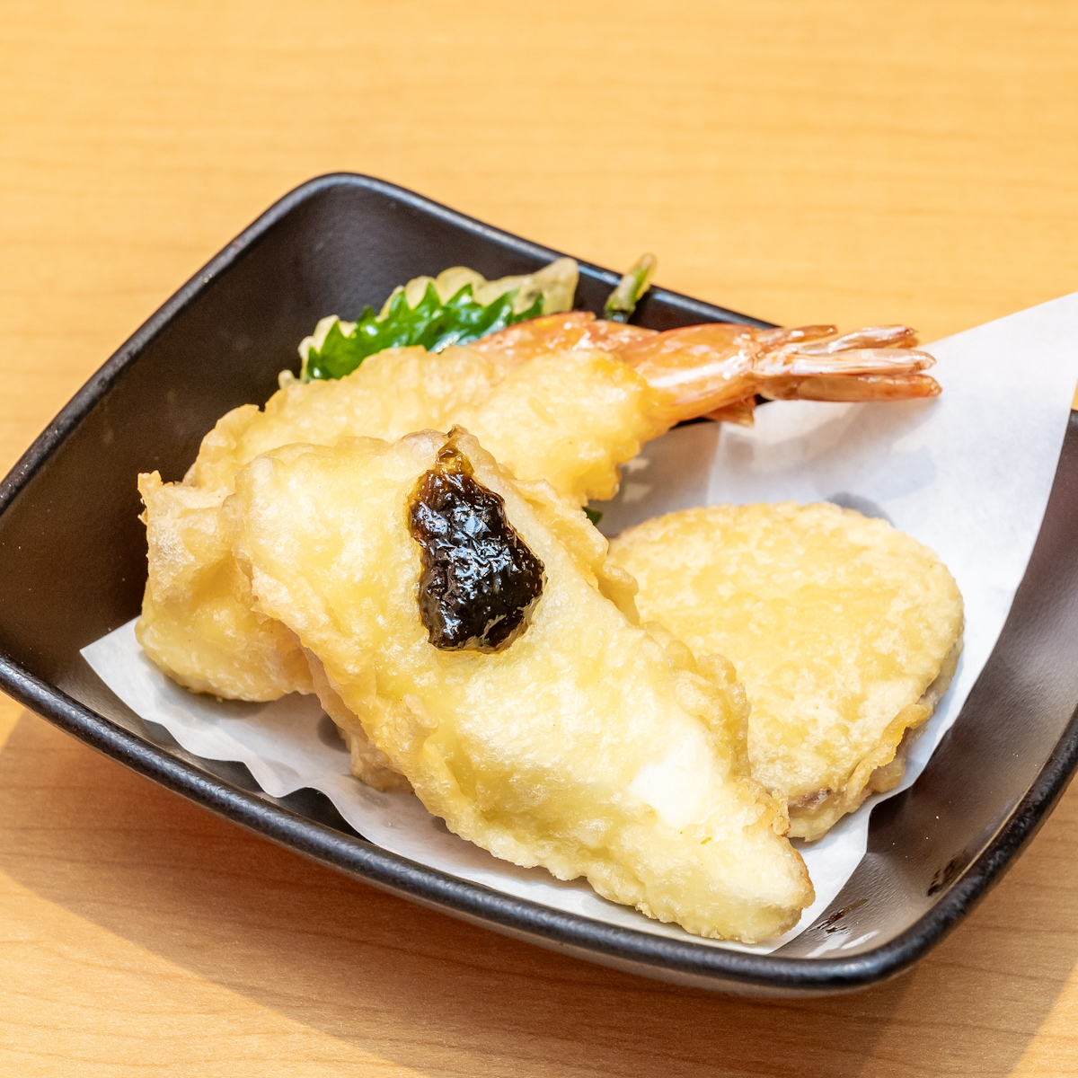 盛り合わせはさつまいもと大葉、えび、真鯛です。