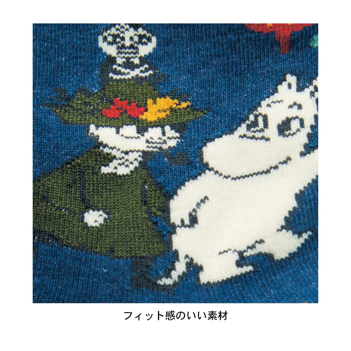 「ムーミン」と「スナフキン」「リトルミイ」の姿が、編み込みで表現されています。