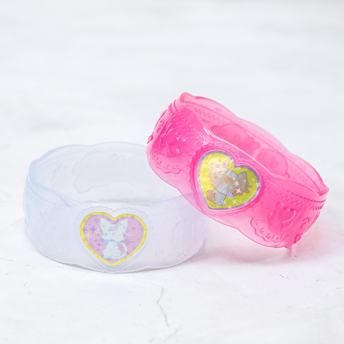 ハート型のホログラムシールに「犬飼こむぎ」と「猫屋敷ユキ」のシルエットが描かれた「こむぎ&ユキ ペアブレスレット」