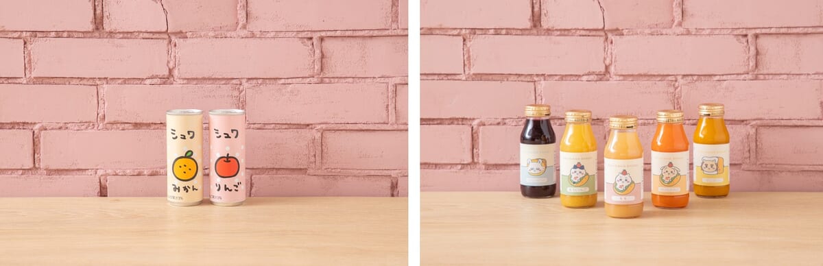 シュワ(みかん・りんご)/ちいかわのもも・ハチワレのおろしりんご・うさぎのにんじん&りんご・モモンガのブルーベリー・シーサーのマンゴードリンク