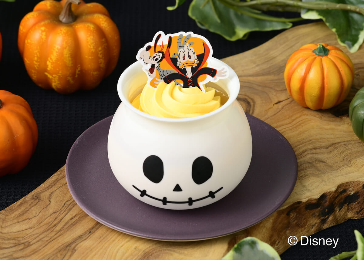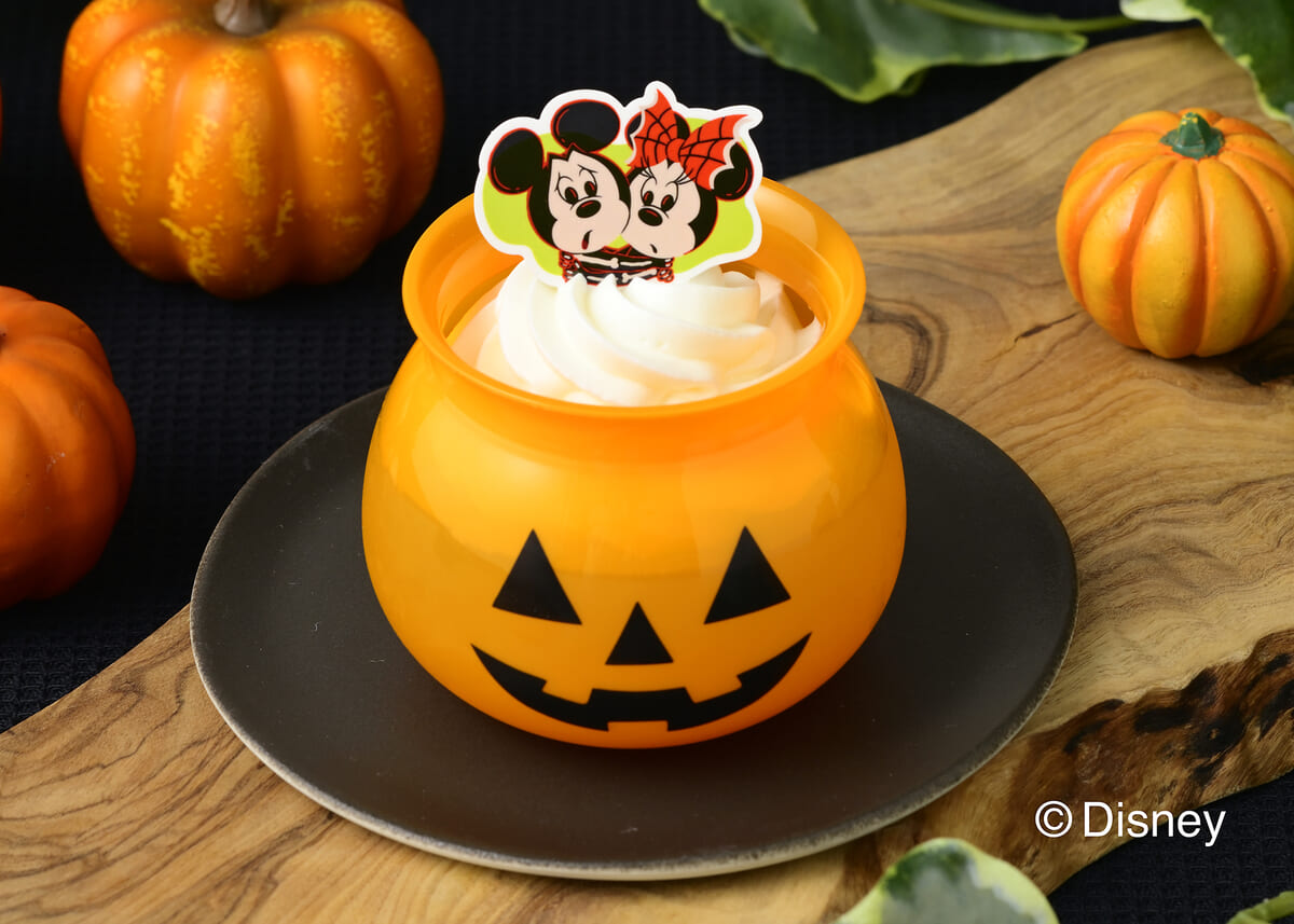 ハロウィンの衣装を着て抱き合う「ミッキーマウス」と「ミニーマウス」のピックを飾った「<ミッキー&ミニー>パンプキンプリン」