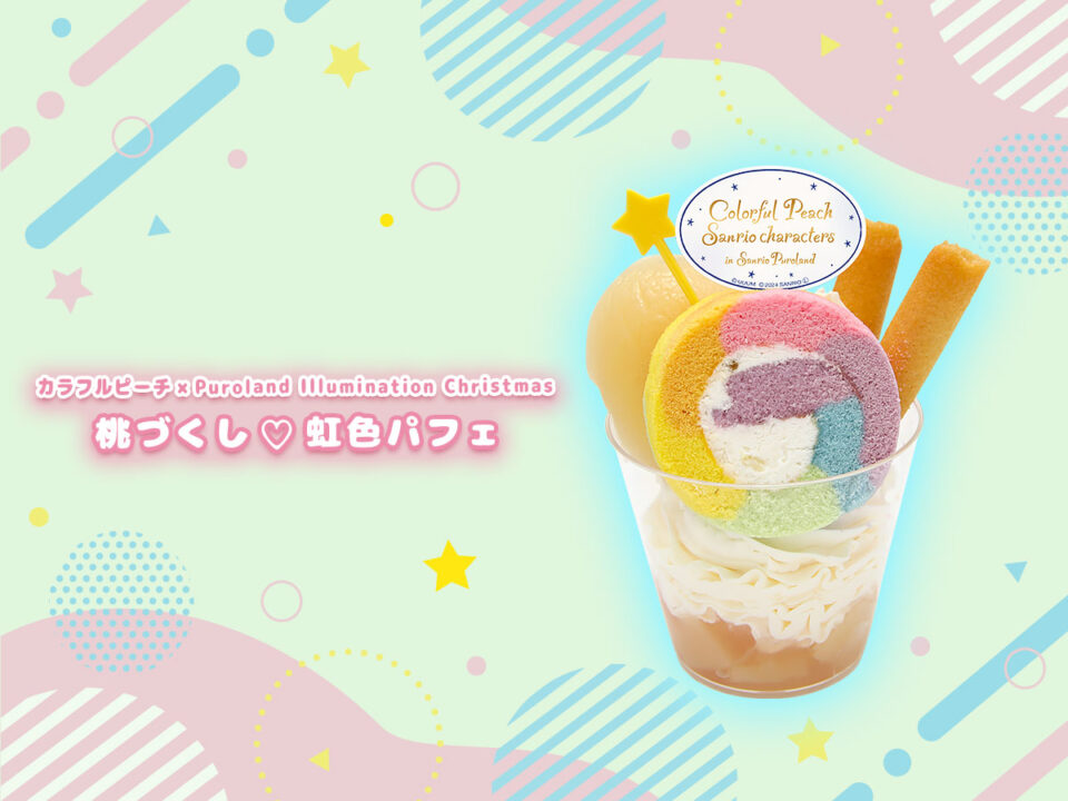 コラボフードメニューとして「カラフルピーチ×Puroland Illumination Christmas 桃づくし♡虹色パフェ」の発売が決定。