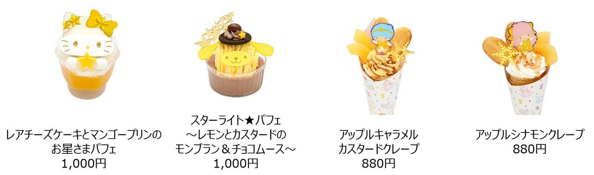 ほかにも、「レアチーズケーキとマンゴープリンのお星さまパフェ」など見た目もかわいいデザートメニューや、「キキ&ララ」をそれぞれモチーフにした「アップルキャラメルカスタードクレープ」「アップルシナモンクレープ」など、全17種類が登場します。