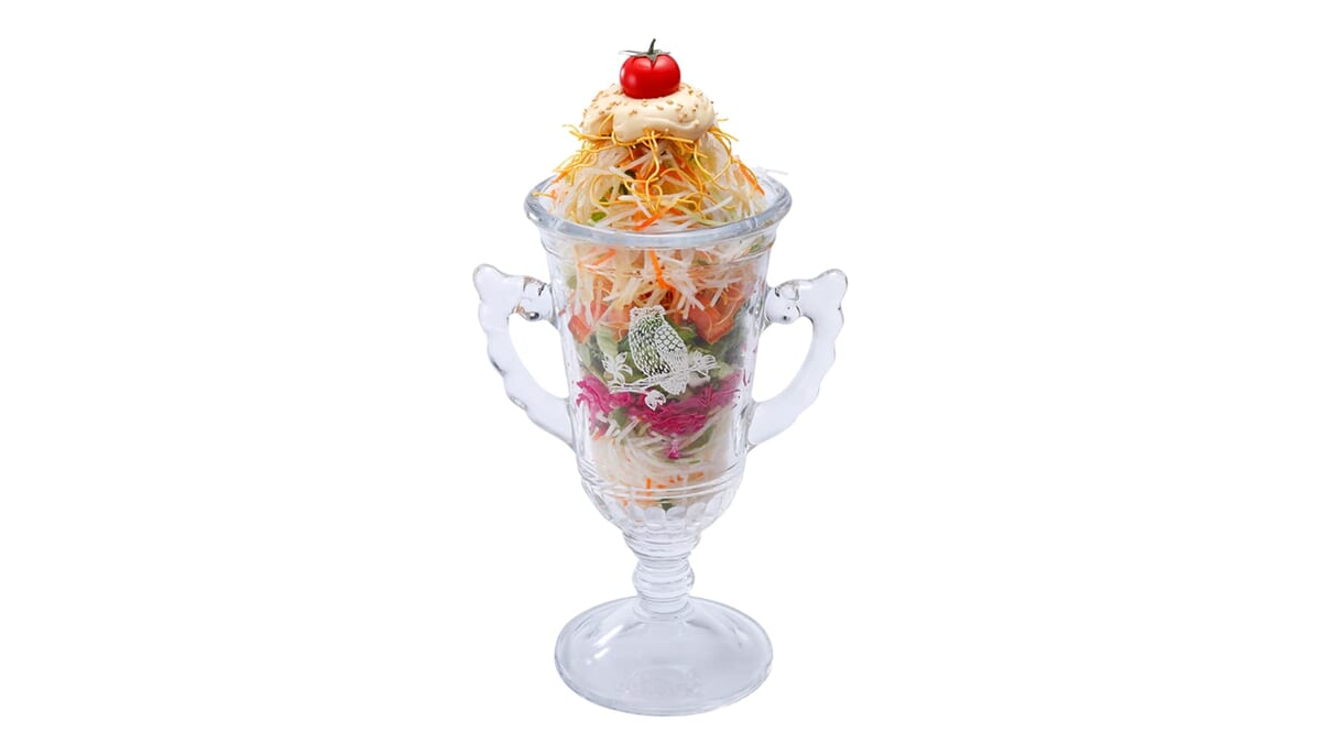 10種類の野菜を使用し、パリパリ麺の新食感が愉しめる高さ25センチの巨大グラスに入れて提供される「ガリバーサラダ」